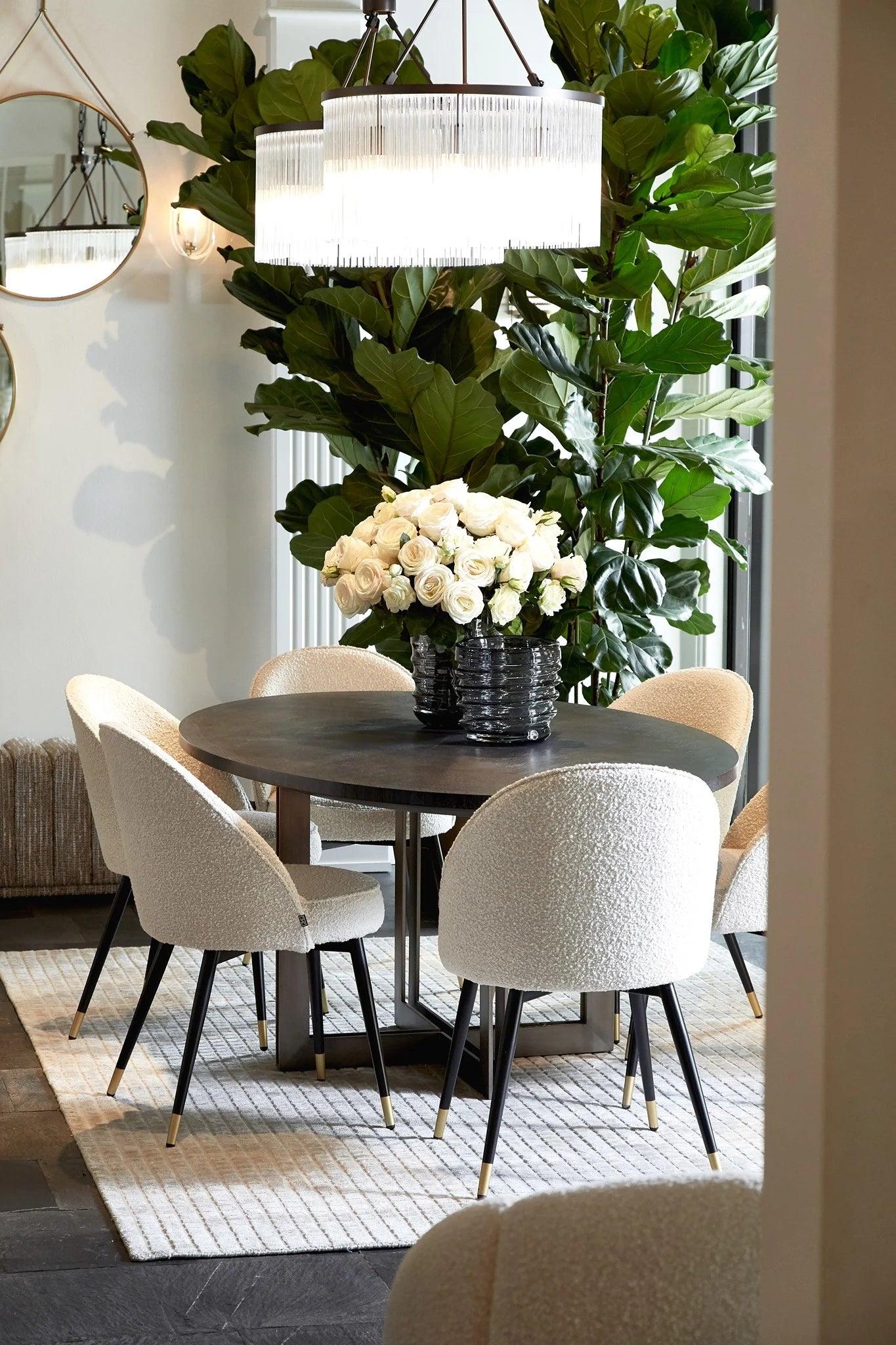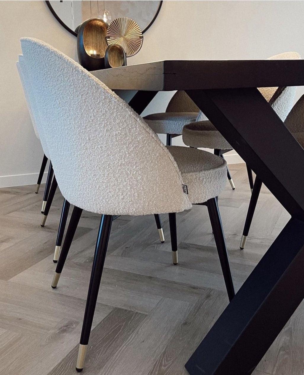 The cream bouclé, which is upholstered and supported, adds softness and subtlety, while being durable and easy to clean. Narrowed black legs creamy chairs They resemble artistic sculptures that end with brass overlays - an accent of luxury and sophistication. The Cooper chair set is not only furniture, it is also an expression of your unique style and care for details. Perfect match for every modern dining room or kitchen with a hint of vintage!