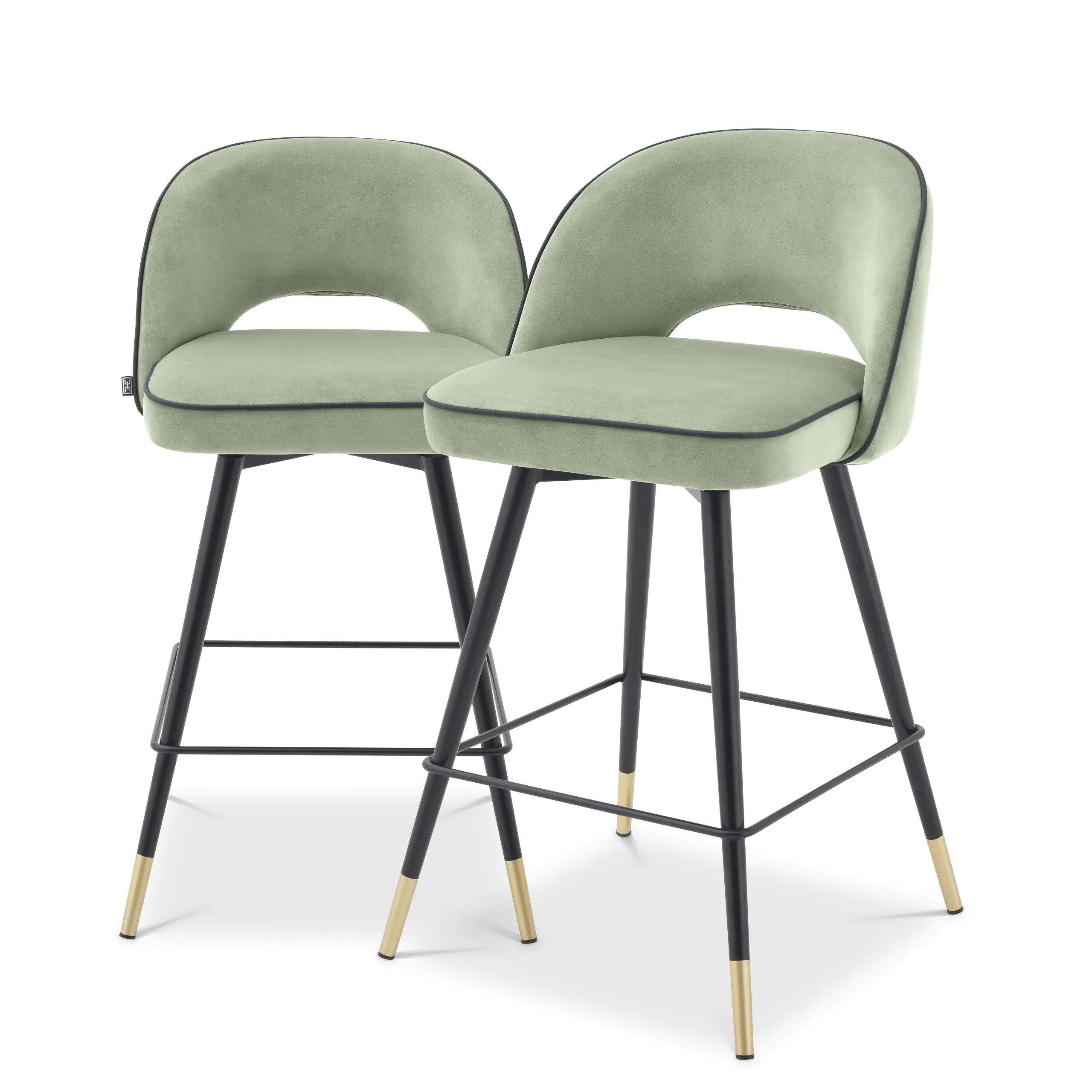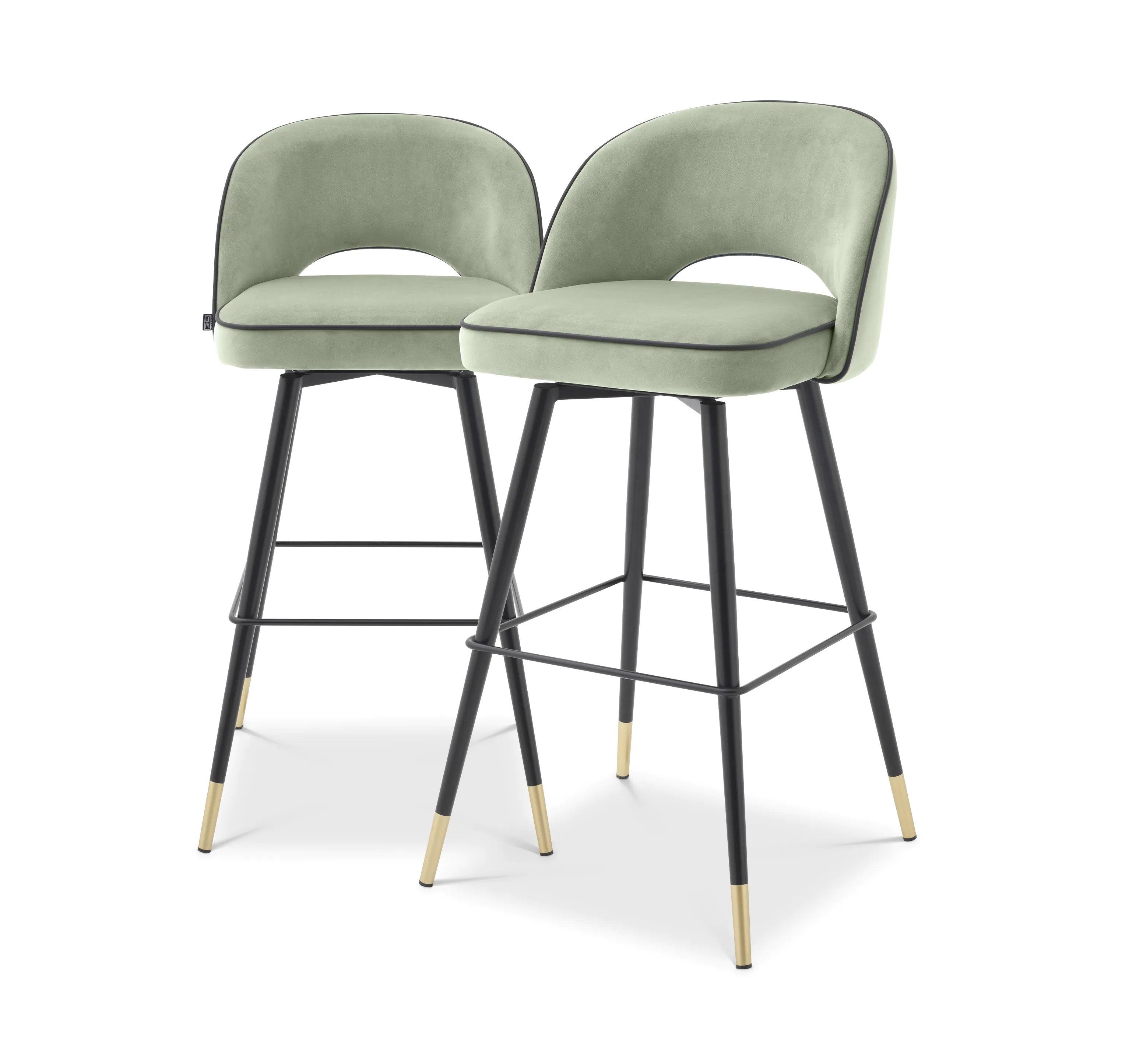 Elevate the elegance and sophistication of your interior with bar stools Cliff. A set of two velvet bar stools embodies the essence of luxury and class. Each pistachio bar stool features a sturdy frame that rests on black, tapered legs with an excellent accent of gold caps. Their uniqueness is highlighted by the armless backrest, which has been artistically opened at the bottom in front of the seat, adding lightness to the design.