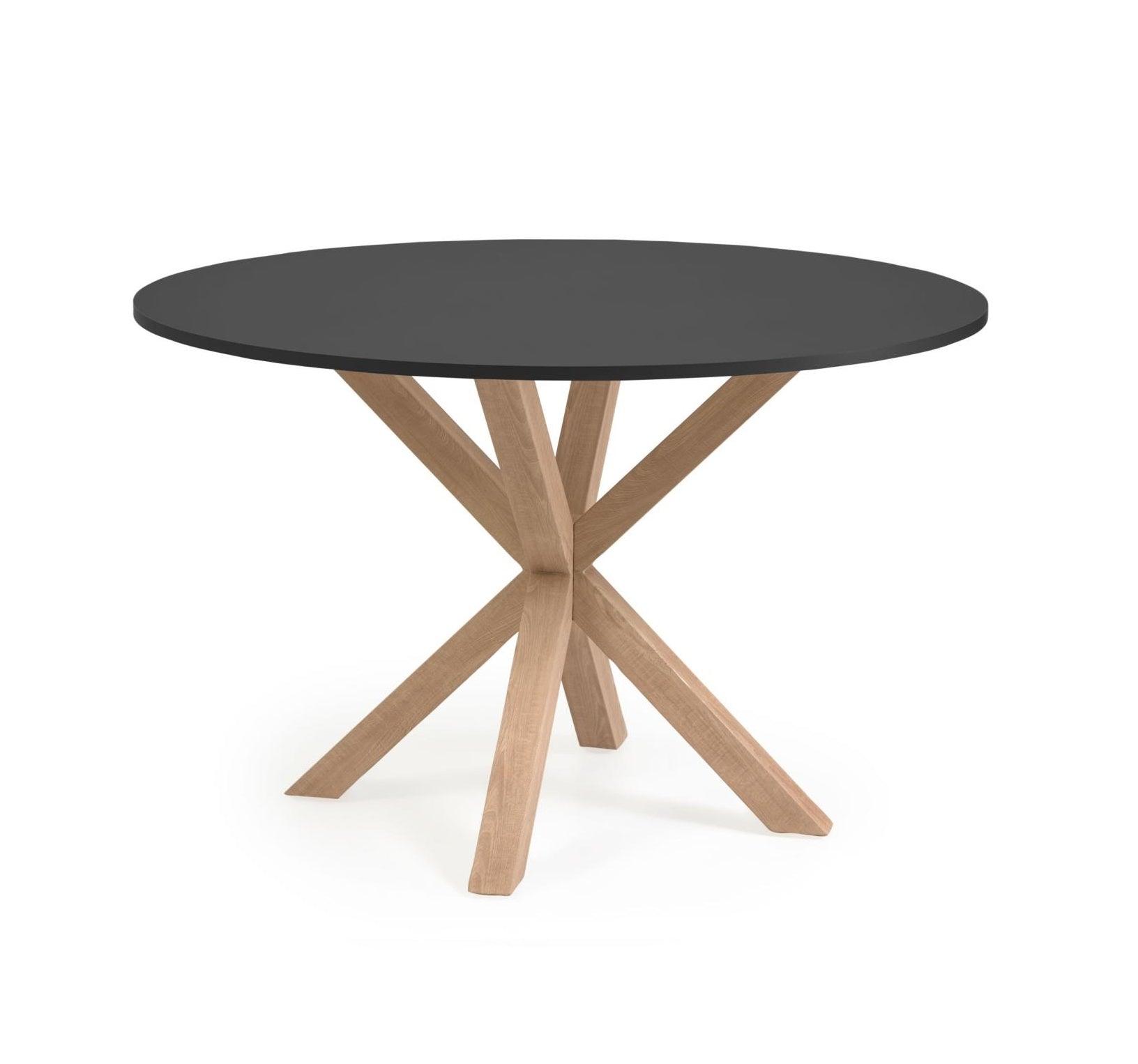Round table Argo in a black finish with a wood-like base is an elegant and functional proposal for modern interiors. The round top made of lacquered MDF with a diameter of 120 cm in black features a coating that prevents fingerprints, ensuring an aesthetic appearance for a long time. The top is also resistant to cuts and stains, making it very practical and easy to keep clean.