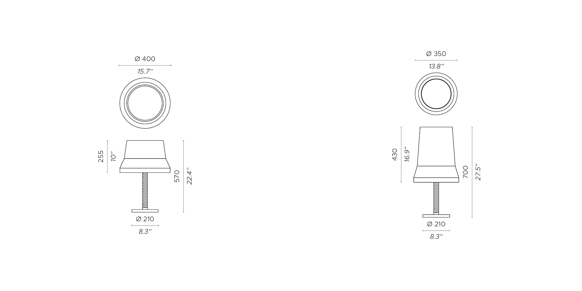 The Audrey collection, consisting of two table versions, a floor version, and a hanging version, was designed as a true exercise in style. Three shades come together: cotton at the top and bottom, san color bouclé fabric in the middle, and new velvet finishes available in various colors. The base is covered with braided silk cord.