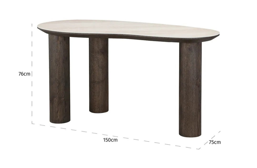Elegant desk Ritz with a modern form is a perfect combination of functionality and exceptional design. The beige tabletop made of travertine ceramic gives it a natural character, while the solid MDF legs ensure stability and durability. The irregular shape of the tabletop emphasizes the originality of the furniture, making it a unique element of the arrangement.