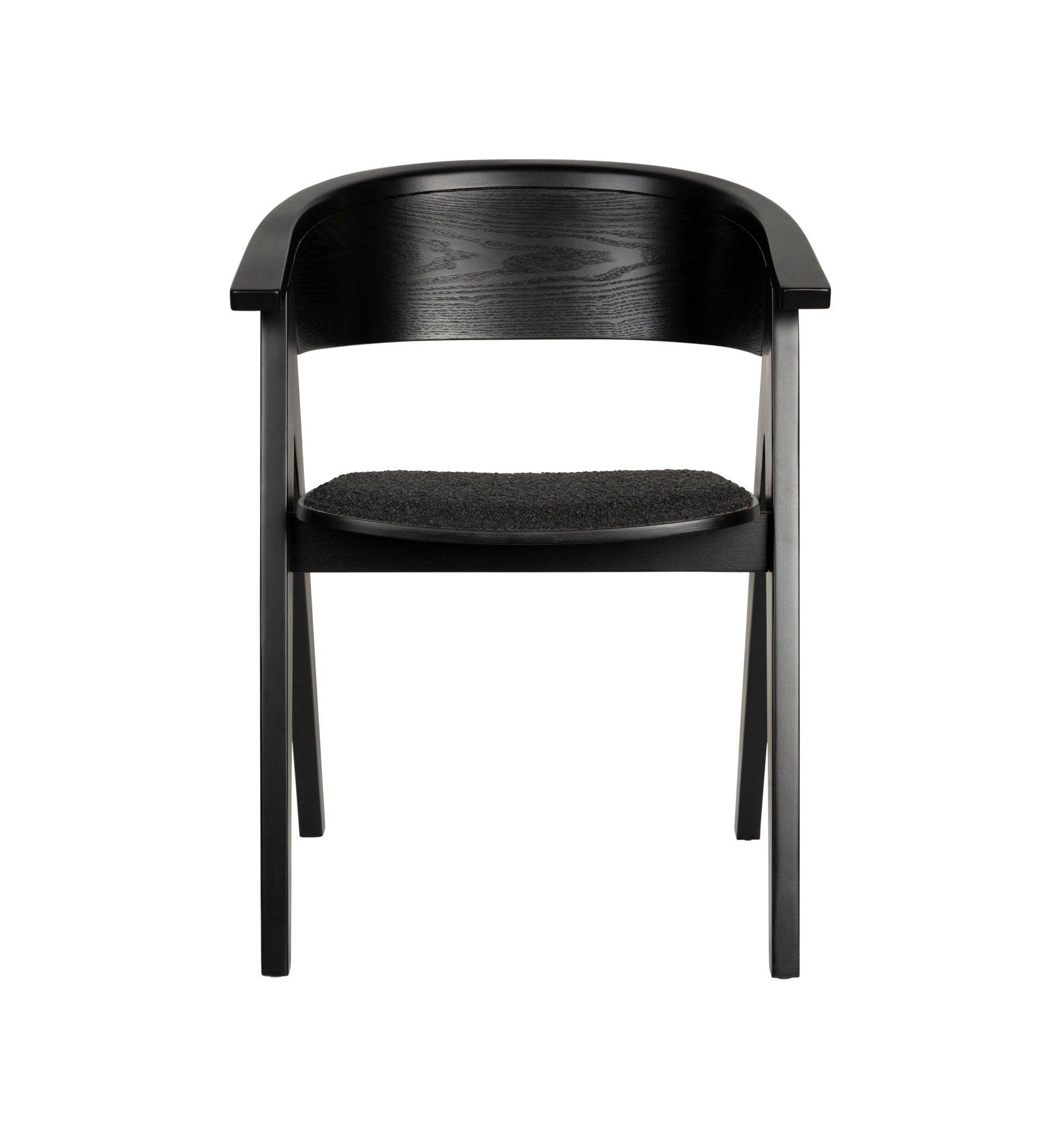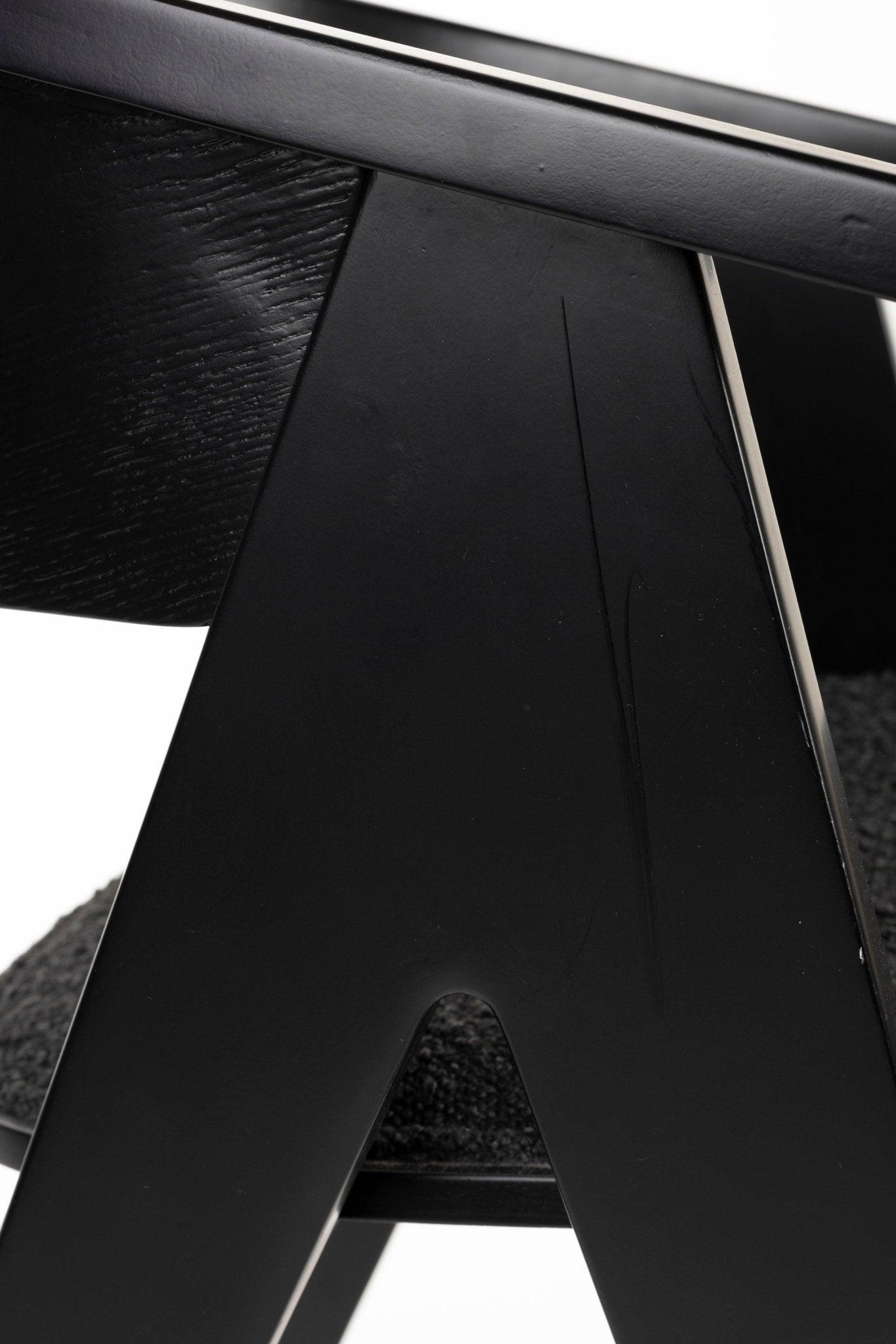 The seat is upholstered in boucle fabric, providing a soft surface to sit on.