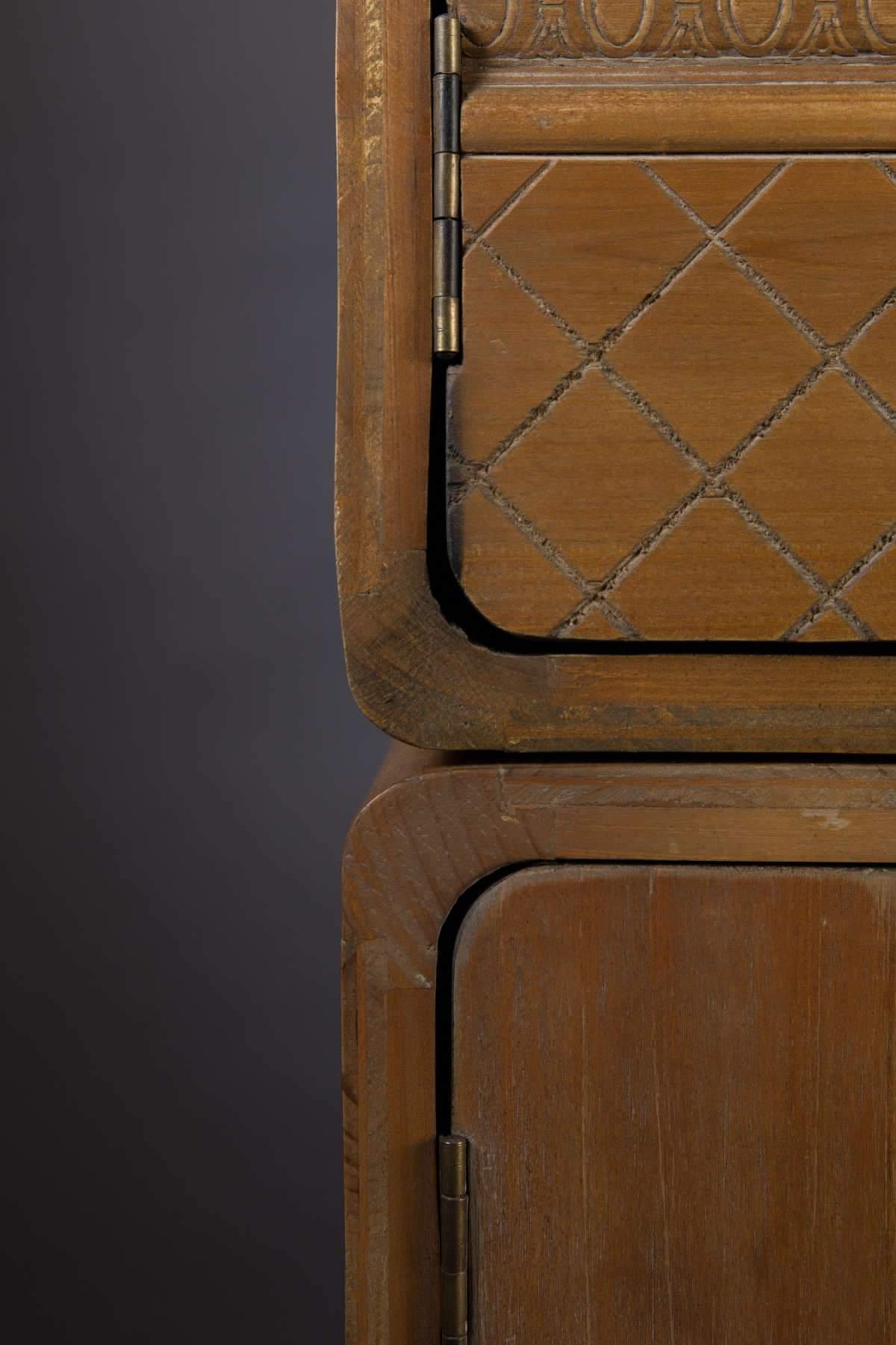 Chest of drawers is made of natural solid fir wood with an antique finish, and the legs are made of anthracite iron. This model is perfect for interiors in vintage, retro, and modern classic styles.