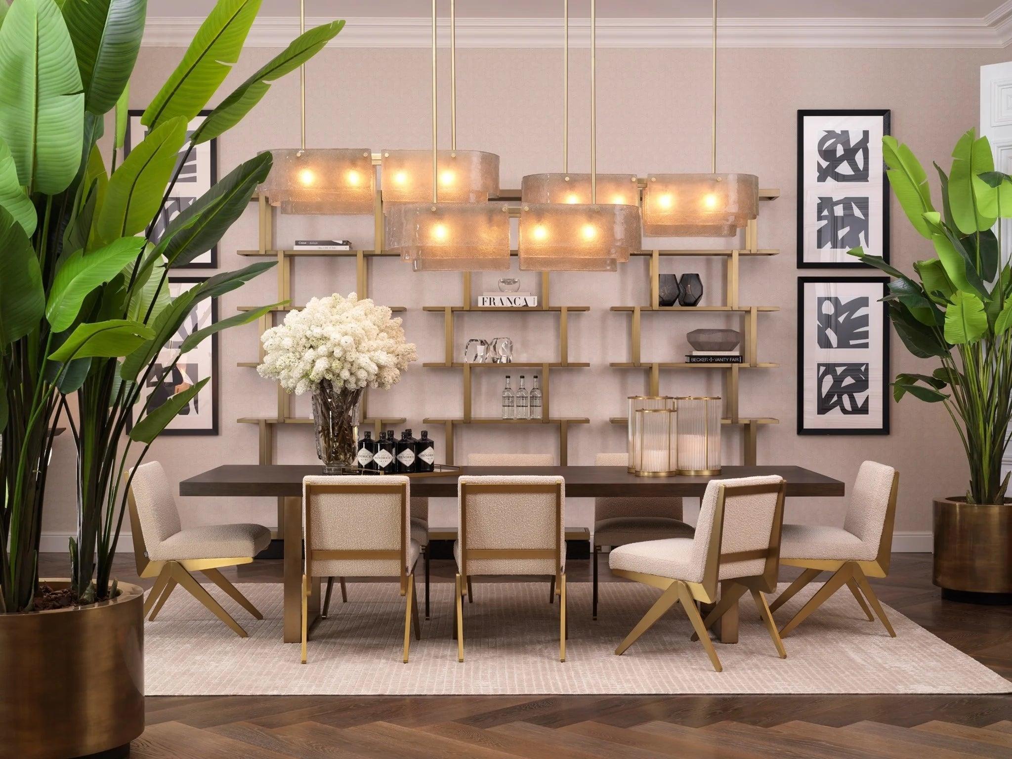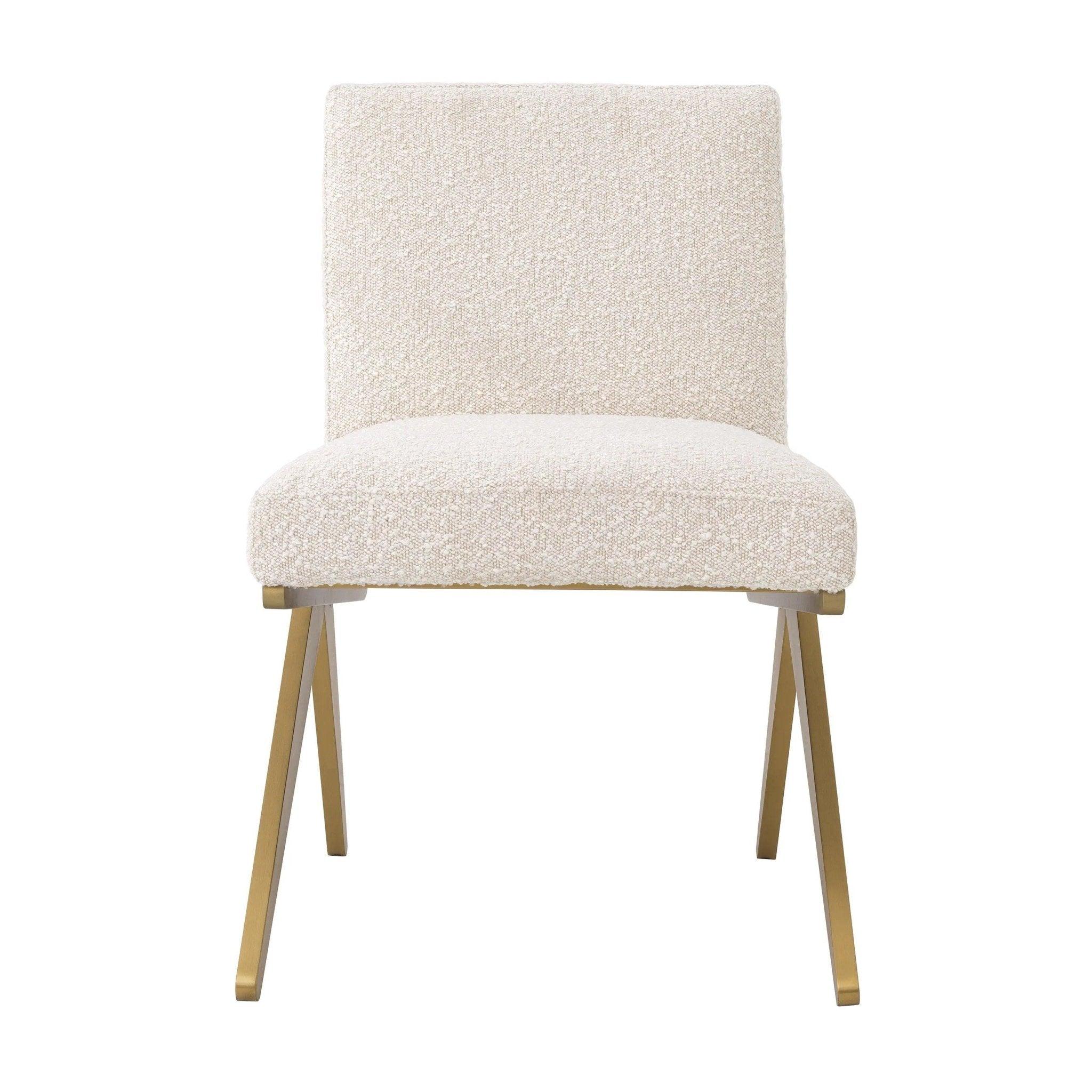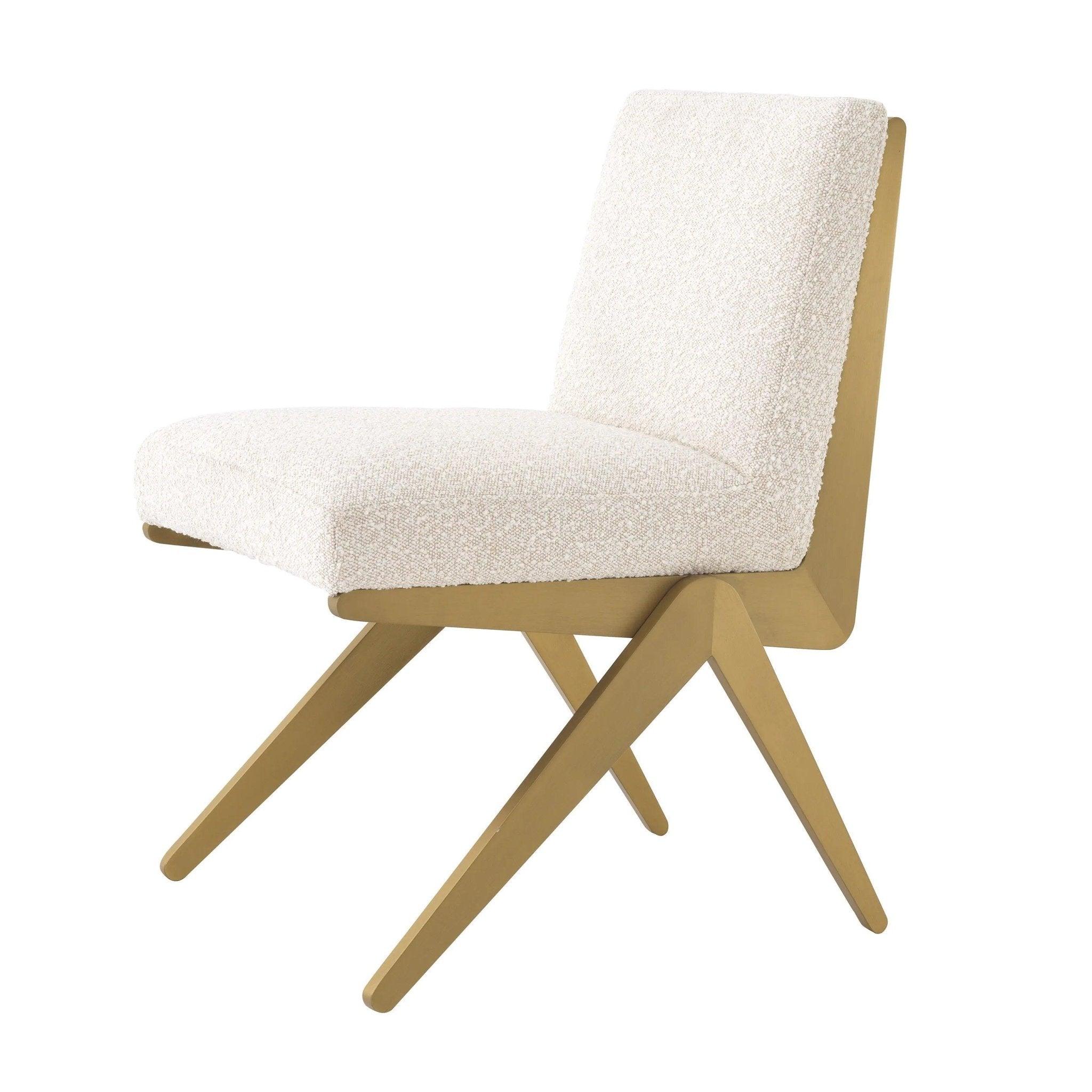 When steel meets the brass, it creates a unique combination of materials. Finishing the frame from brushed brass adds elegance, while the solid construction guarantees durability for years. The lack of armrests emphasizes the minimalist aesthetics, and the cream upholstery Bouclé encourages to spend long hours at the table in comfort.