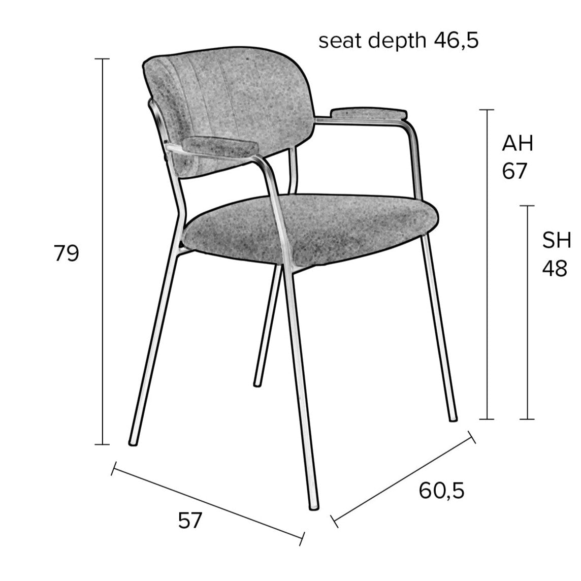 Chair with armrests Jolien is distinguished by an elegant, modern design. It has a steel frame powder painted in black and a seat and a back of plywood and PU foam, covered with dark gray upholstered fabric. The backrest is slightly bent and quilted, which increases comfort. Upholstered armrests support the correct posture. Perfect for the kitchen, dining room and more representative rooms, such as a living room or a guest room.