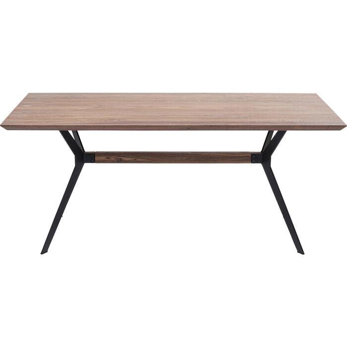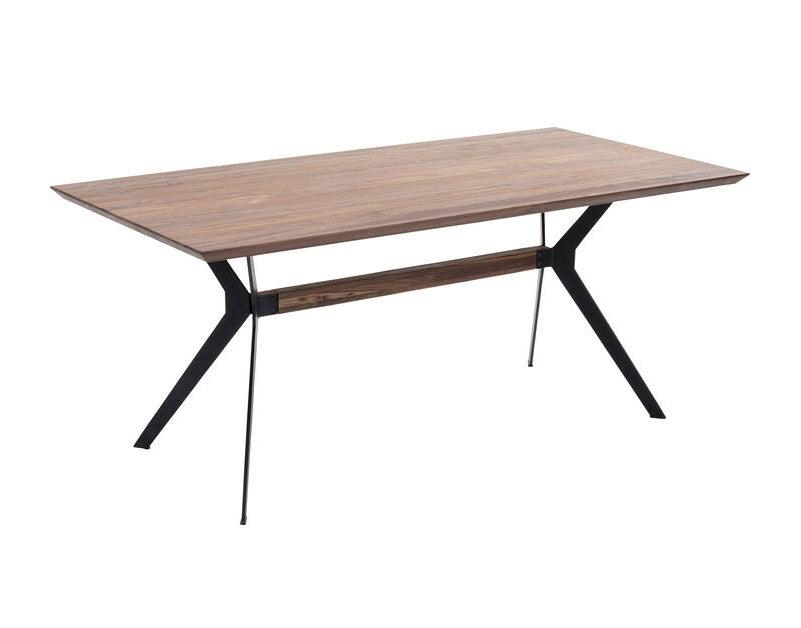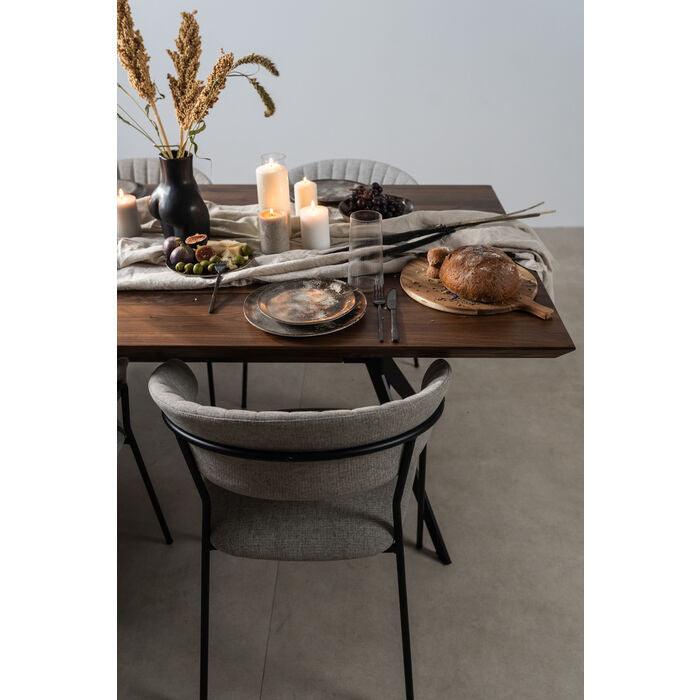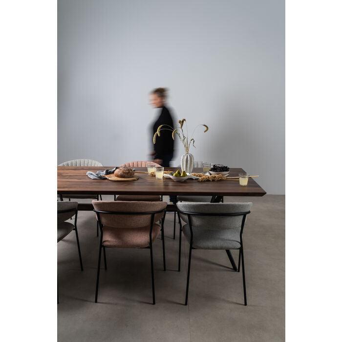 Dining table with a designer flair. The surface of the tabletop made of solid wood features a distinctive, natural grain pattern. The lacquer provides an elegant surface with a protective layer. The dynamically shaped base made of black steel gives this dining table a sense of dynamism and lightness. As a stylish addition, the wooden central support of the frame harmonizes with the tabletop.