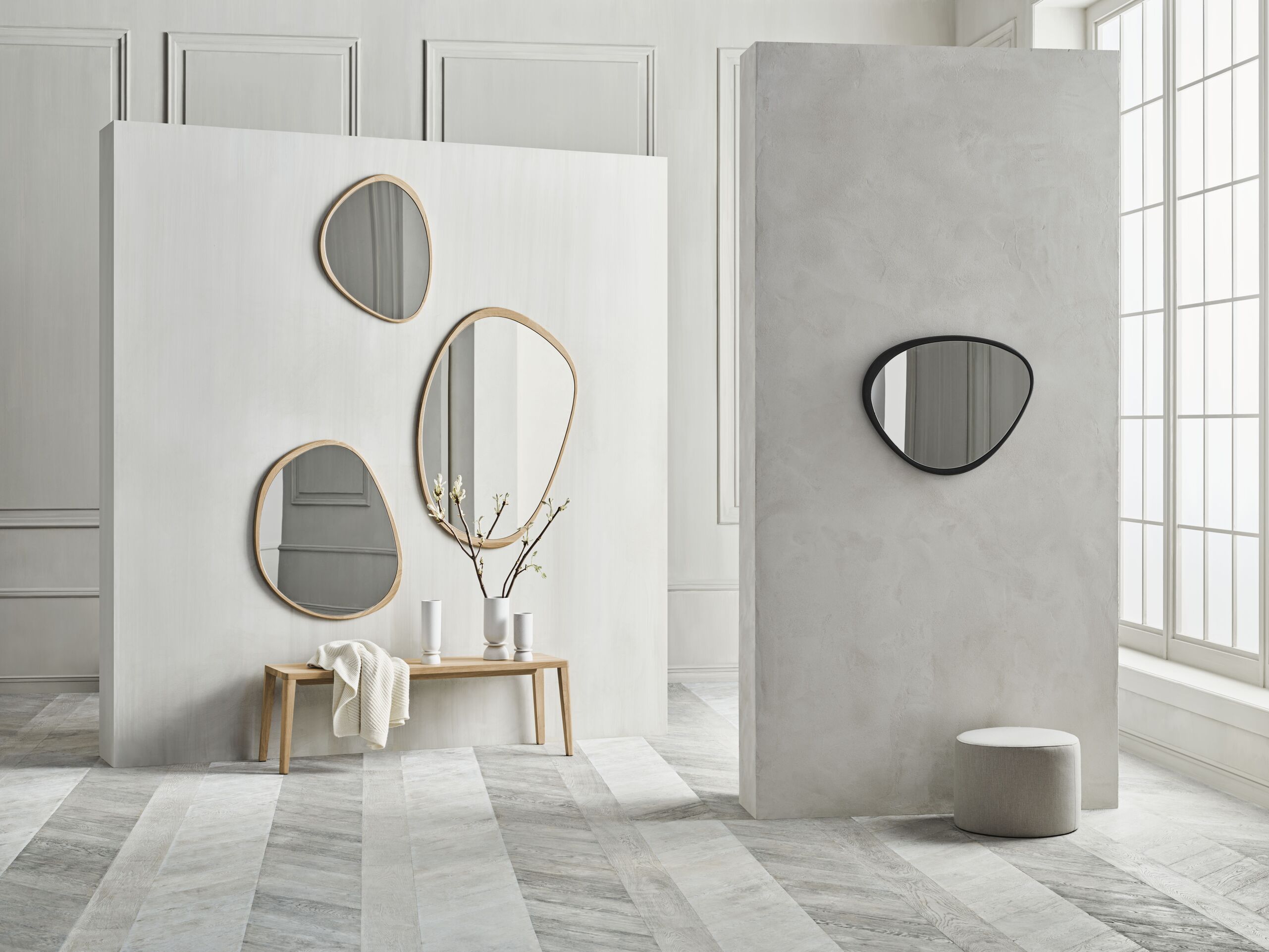 Made from solid oak certified by FSC®, the mirrors Elope combine the beauty of natural materials with durability and a sustainable approach. Their rounded, organic shapes echo the gentle contours of the islands, bringing subtle harmony and elegance to the interior.