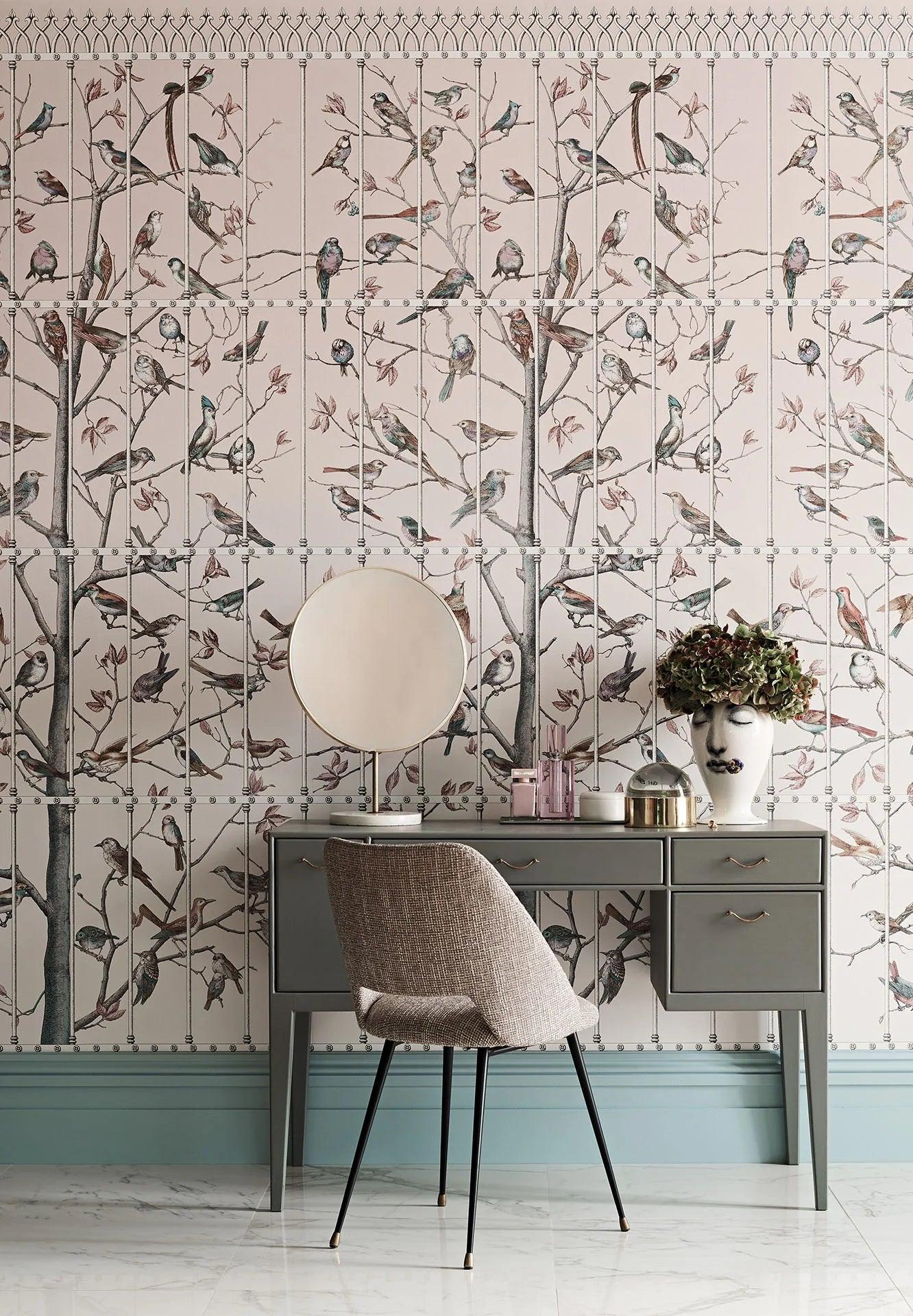 Wallpaper with birds depicts colorful birds of various species on a small tree, viewed as if from behind the decorative gates of a garden. The decorative panel can serve as a single beautiful adornment for a room, and when repeated on the wall, it can create a kind of vibrant aviary. This design will bring a touch of nature indoors, making arrangements cozier and more inviting.