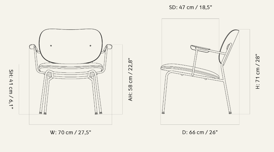 Co Lounge Chair is an elegant and comfortable proposal designed by Norm Architects and Els Van Hoorebeeck for the brand Audo. It features a light, modern form, where the slender steel frame contrasts with the soft, upholstered seat and backrest. Subtly curved armrests and a suitably inclined backrest provide excellent support and comfort even during extended sitting.