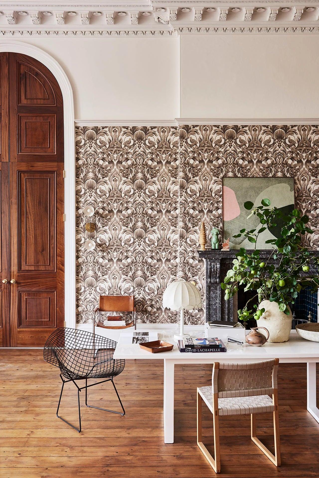 Wallpaper Gibbons Carving was inspired by the work of the 17th-century Gibbons sculpture master. The pattern is full of details and depth, showing birds, fruits, leaves and periwinkle flower. Grinling Gibbons' works were highly valued among members of the royal family.