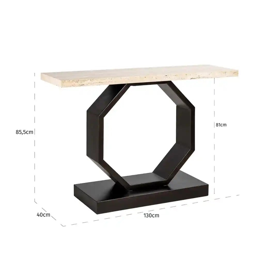 Elegant console Avalon with a modern character is a combination of the natural beauty of stone and geometric form. The solid 4 cm thick travertine top is supported by a black octagonal base made of iron and plywood, giving the furniture exceptional stability and a unique design. The harmonious combination of materials makes the console perfectly fit into luxurious, modern, and eclectic arrangements.