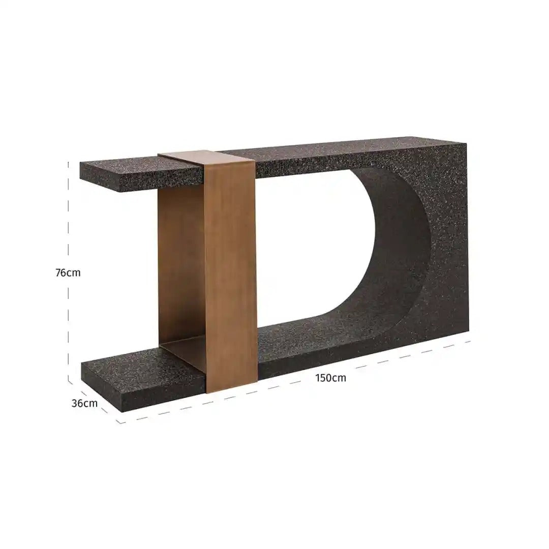 Elegant console Bazel with a sculptural form is a modern piece of furniture that delights with its minimalist design and striking contrast of materials. The combination of dark, grainy texture with a warm, metallic accent in copper color creates an unconventional composition, perfect for modern, loft, or industrial interiors.
