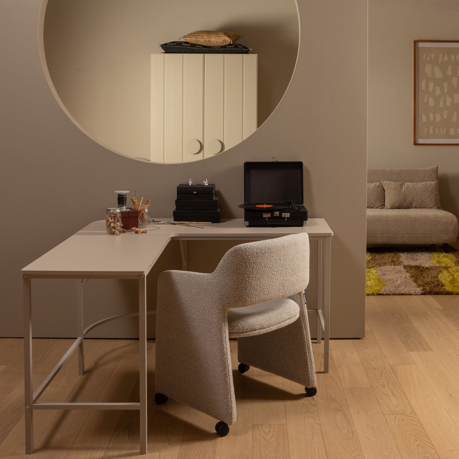 Dining chair LYRIC is a combination of elegance, comfort, and functionality. With its comfortable seat and practical wheels, the chair is perfect for both the dining table and a home office. The upholstered legs in the same color as the seat give it a unique, luxurious appearance. The fabric with a melange finish in a greige shade subtly highlights the modern character of the interior.