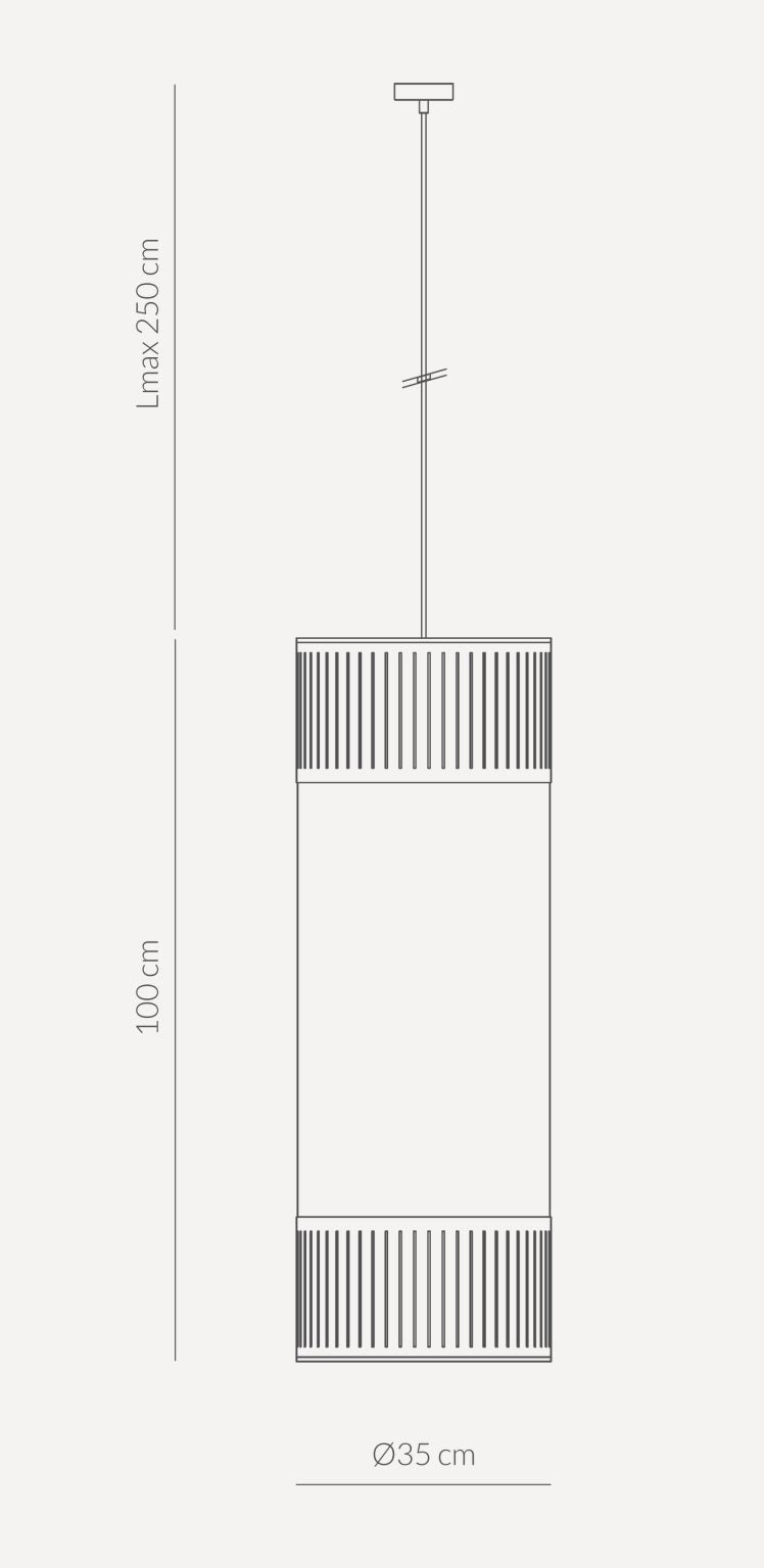 The Tamiz pendant lamp features an elegant, cylindrical shape that combines natural materials with a subtle play of light. This designer pendant lamp pairs transparent wooden leaves in a walnut finish with soft fabric, creating a delicate light-filtering effect. The harmonious, vertical form adds lightness to the interior and introduces a warm, cozy atmosphere.