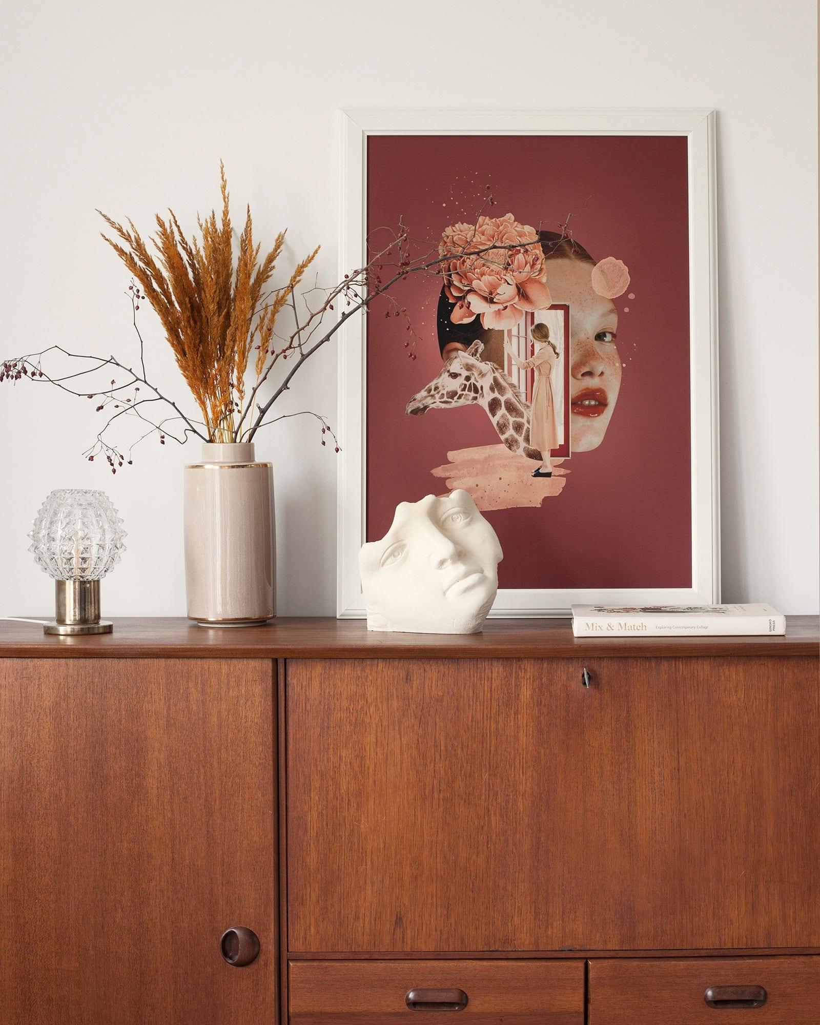 Grafika Look What Is Inside You is an extraordinary design that captivates with its unconventional yet perfectly thought-out form. This poster is not only an interesting decoration but also a work of art. The combination of many different shades of muted pink adds coherence to the entire graphic, while the incorporation of unexpected elements such as a part of a giraffe introduces the observer to a fairy-tale world of dreams.
