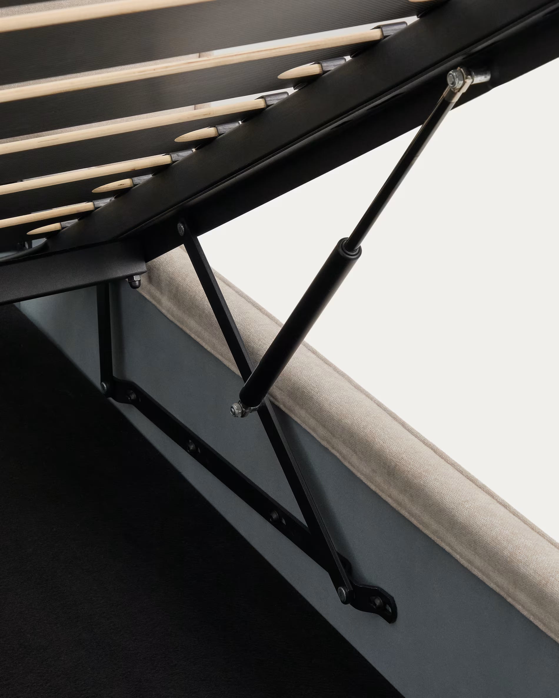 The solid construction based on a powder-coated steel frame and a system of two 900N gas struts allows for easy and quiet opening of the storage compartment. The interior offers ample storage space, while the base made of steamed poplar slats reinforced with plastic elements minimizes noise during use. This upholstered bed combines aesthetics, durability, and order, creating a harmonious space conducive to relaxation.
