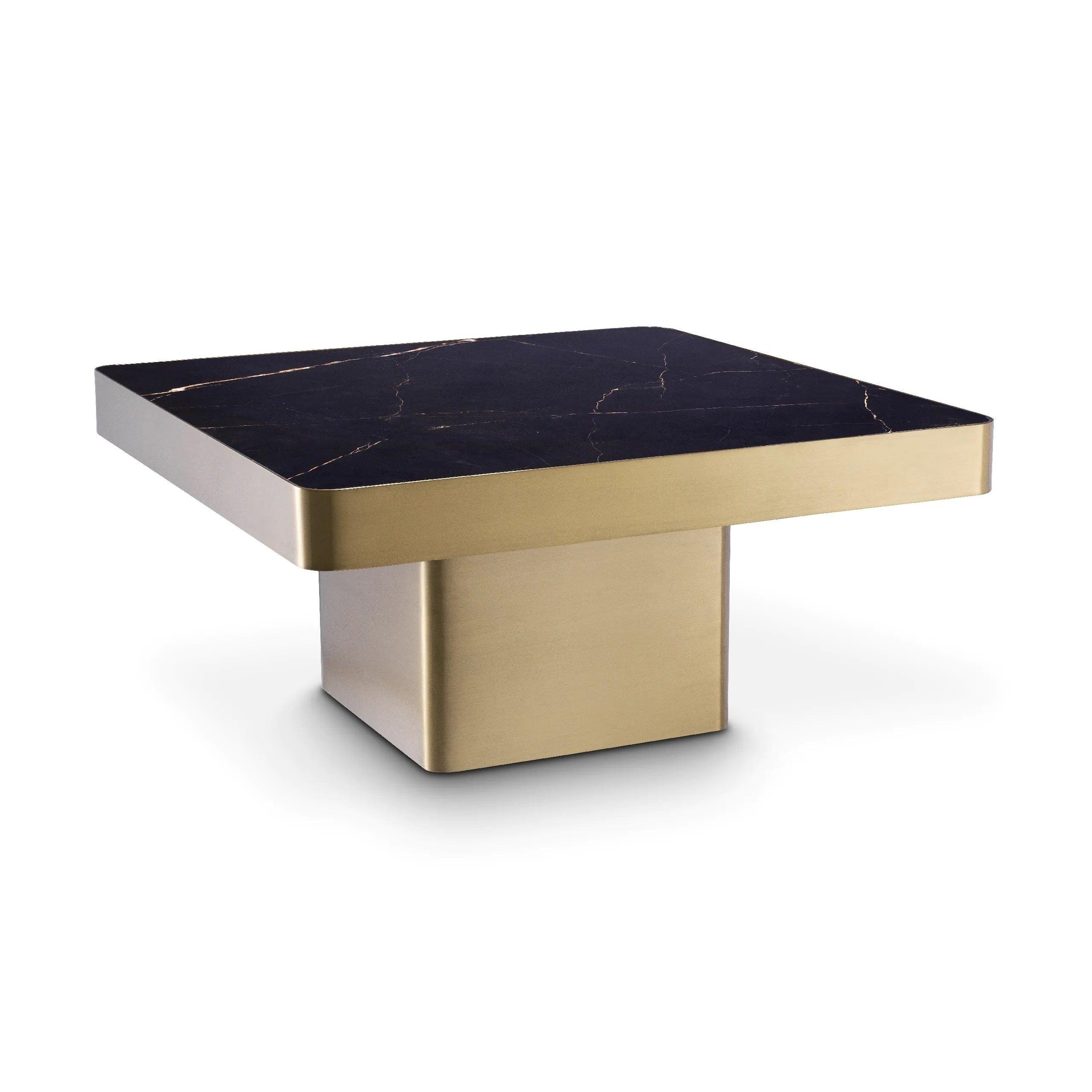 The rounded corners add subtlety to the table and make it appear lighter, despite its solid construction. The base with a brushed brass finish adds shine and catches the eye, while contrasting with the dark ceramic top that mimics the look of marble. The edge of brushed brass serves as an additional, striking accent, highlighting the elegance and sophistication of the table.