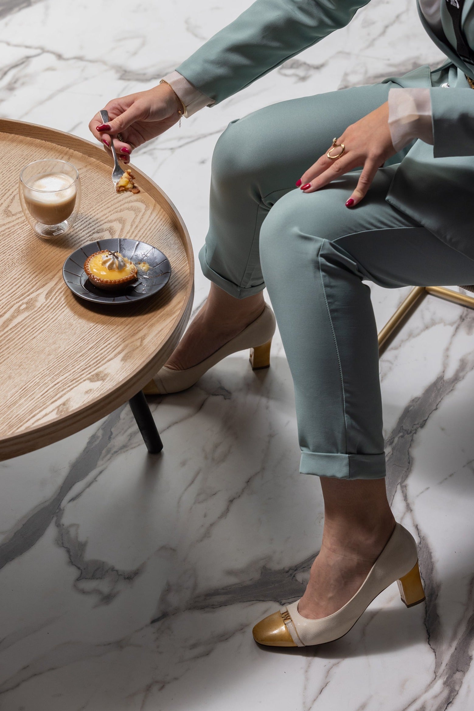 Mango wood + travertine, lacquered finish