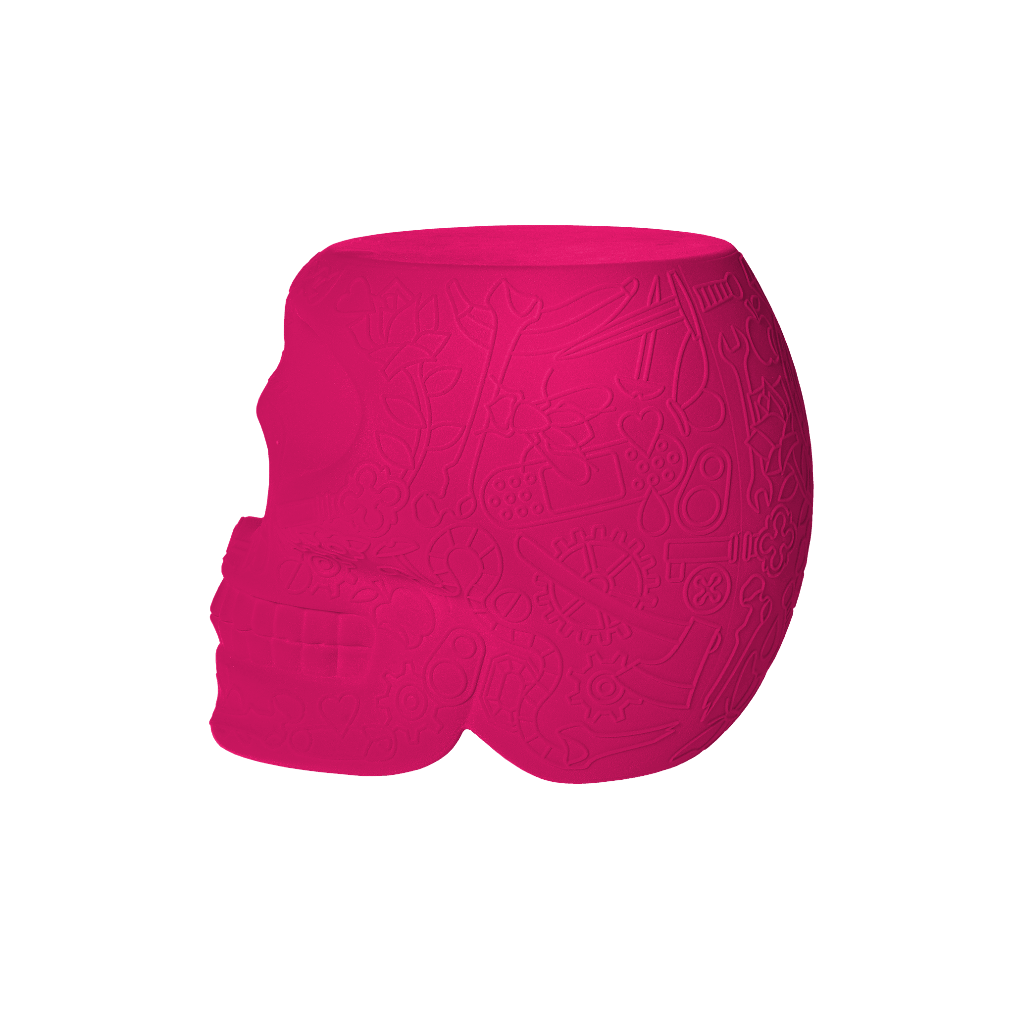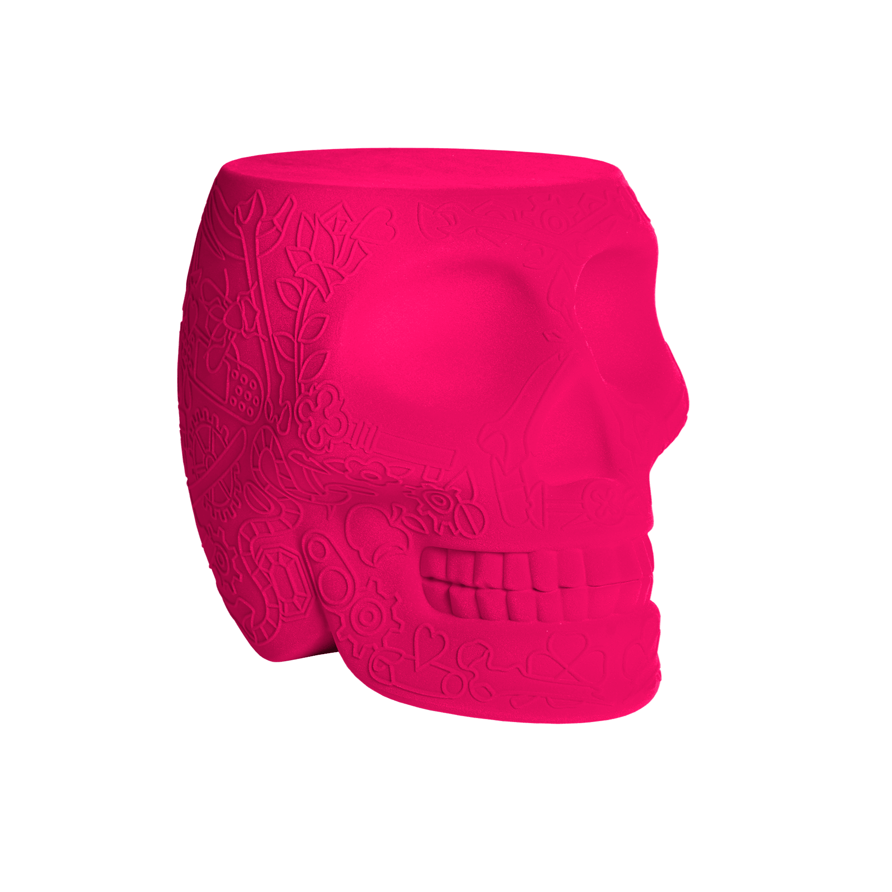Mexico, designed by Studio Job, is a skull-shaped piece with a graphic pattern on the surface, serving as both a stool and a table. This design is inspired by the Day of the Dead - Día de los Muertos, a vibrant celebration in Mexico. This colorful and musical event has an incredibly joyful character, which the creators aimed to capture in the design.