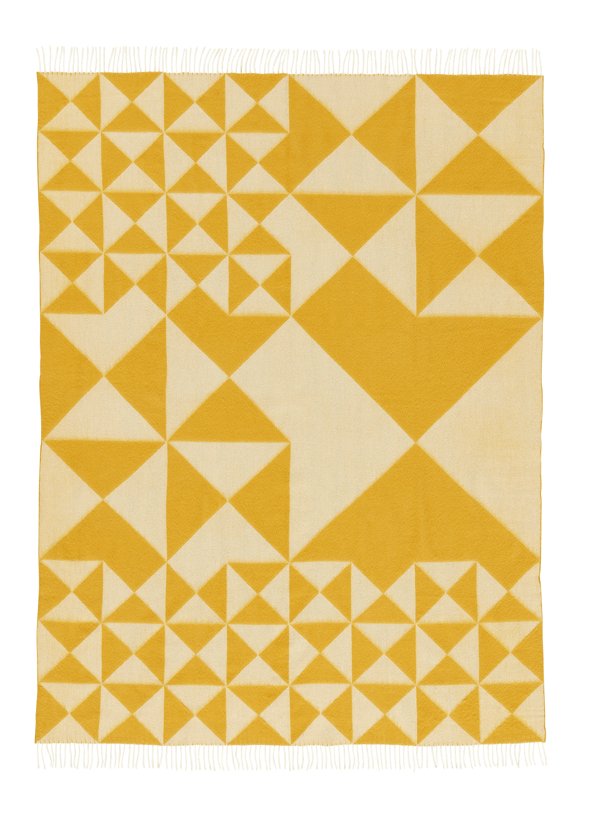 Overlay Mirror Throw in an energetic yellow shade, decorated with the iconic Mirror Sculptures pattern, combines stylish design with the pleasure of use. Inspired by the characteristic pattern by Verner Panton, the Mirror Throw bedspread was carefully made of 100% wool, which not only ensures an aesthetic appearance, but also guarantees comfort during use. This is not only a practical addition to the interior, but also an expression of a personal style and joy of arranging space.