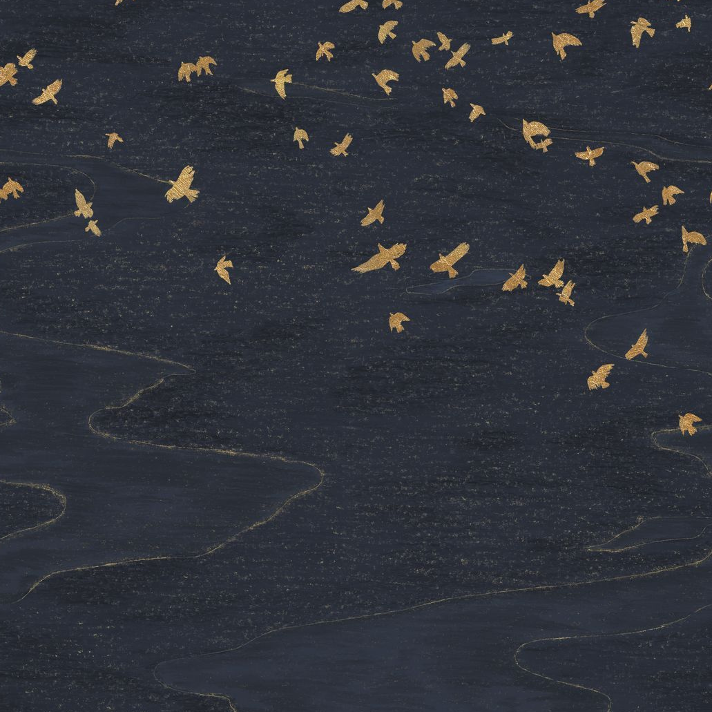 Animal-themed mural of birds MIGRATION in navy blue with gold