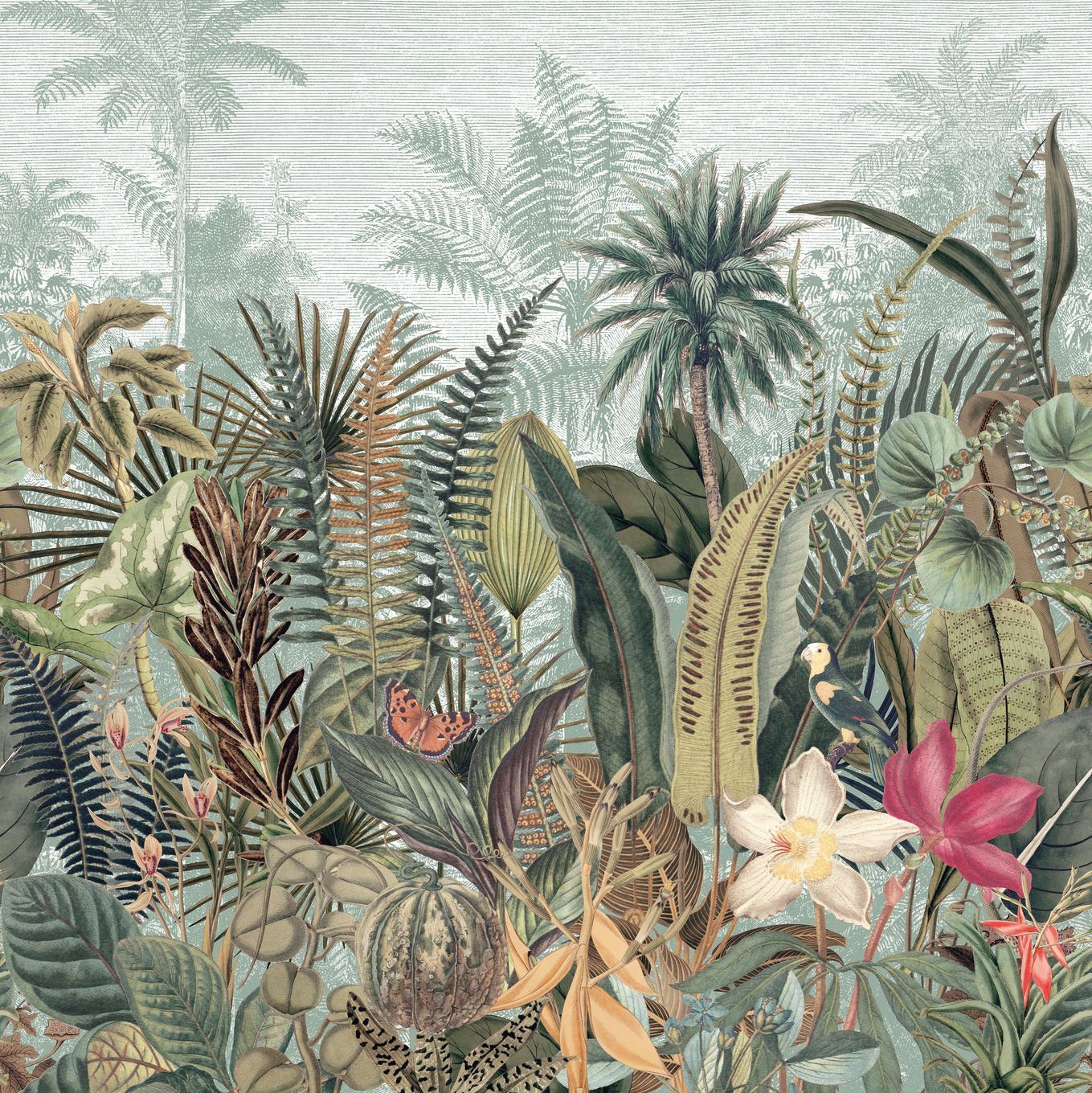 Daintree Plant-Themed Mural - Celadon/Kaki Light Green with Khaki