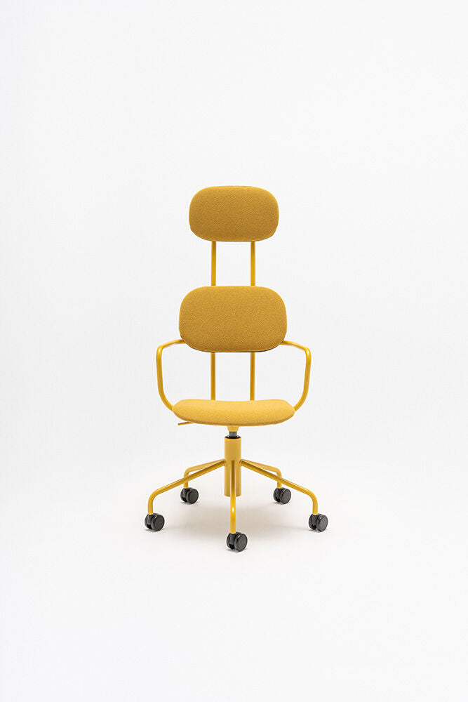 Office chair with headrest New School, designed by the Studio for Form US with Love, is available in an upholstered version with an adjustable base. Modern double support immediately attracts attention, and the headrest provides support to the whole back, which makes the chair ideal for long work or study. Equipped with a cylinder and wheels, it does not limit the freedom of movement, increasing functionality in office spaces.