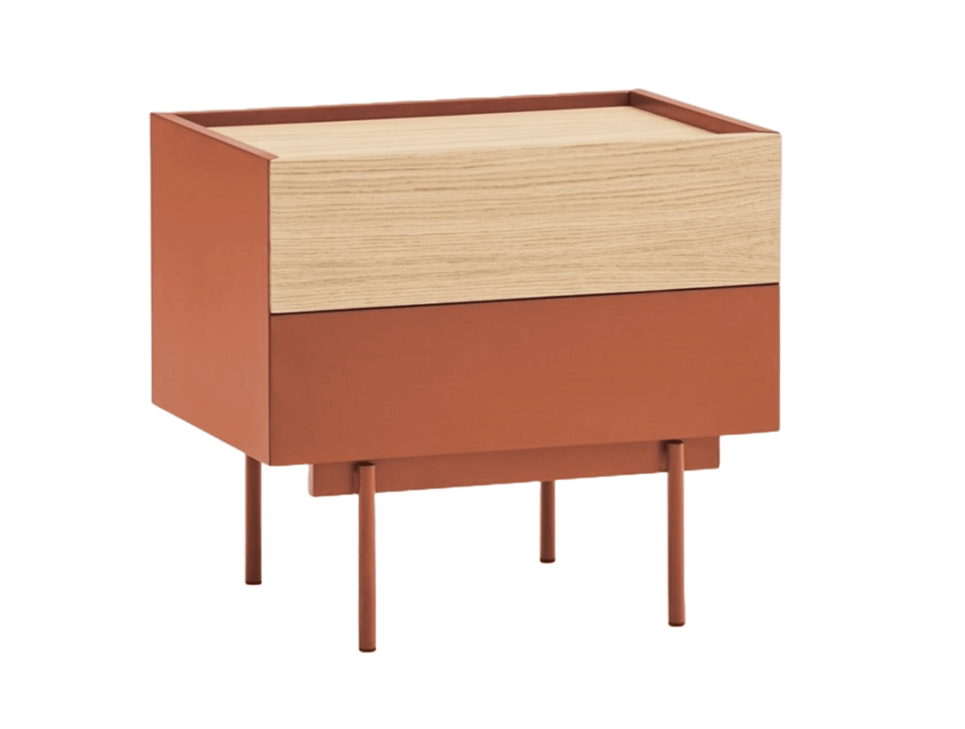 Standing bedside table On the Otto legs in cinnamon color is distinguished by a modern style with clean lines, where the color harmoniously combines with the accents of natural veneer, which allows it to match it to various spaces. Its design with legs adds elegance and lightness, and solid support ensures stability.