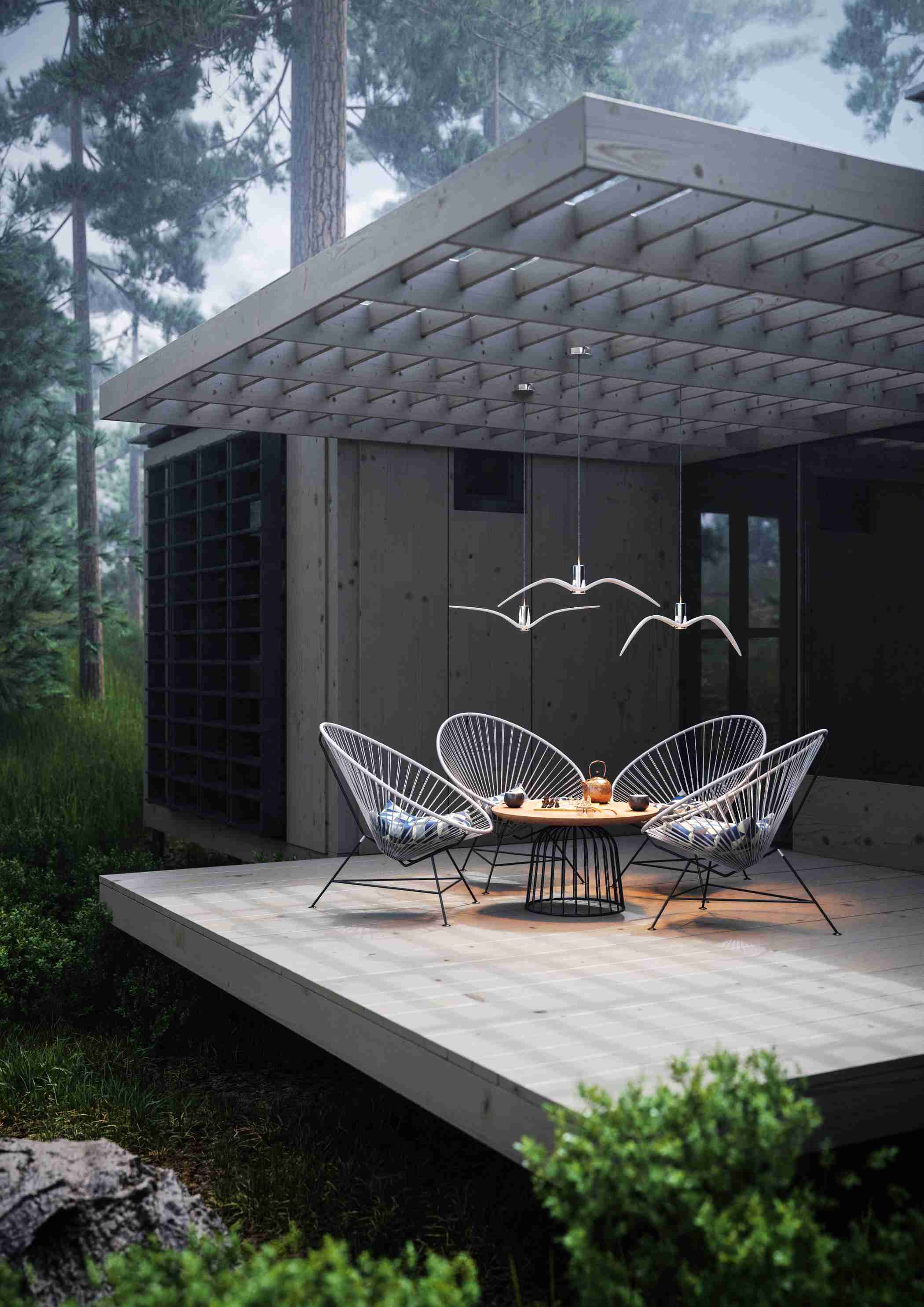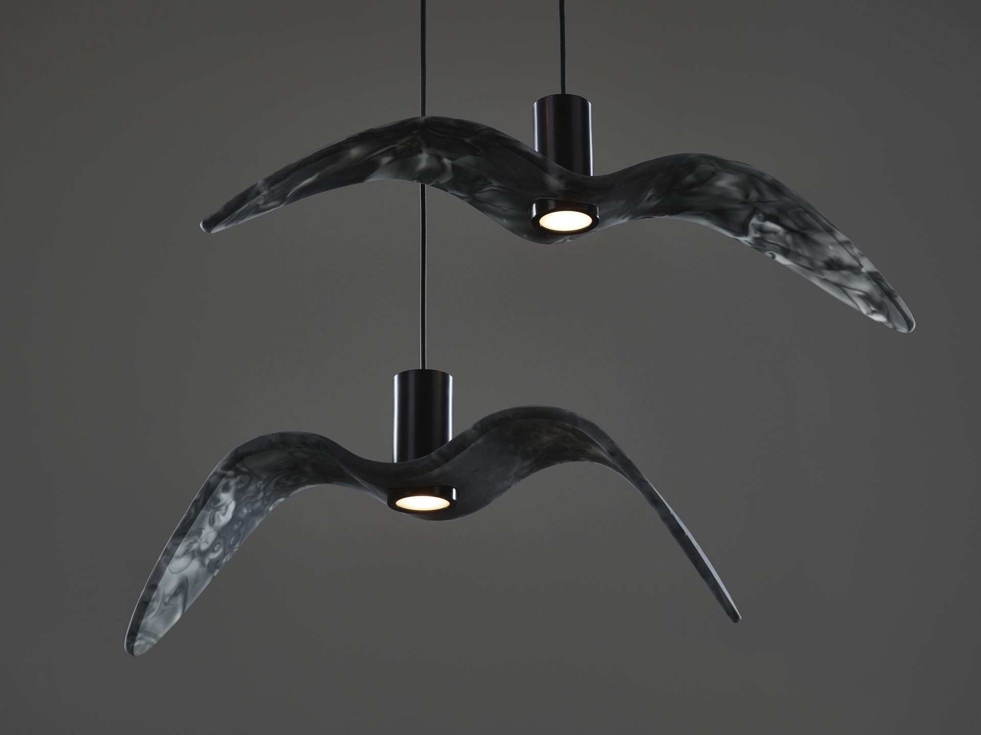 Inspired by the freedom of bird flight, external hanging lamps Night Birds bring dynamics and poetic spell to the space outside. Production technology, consisting in forming glass by blending and bending, allows you to obtain unique nuances of shapes and colors. Each lamp from this collection, embedded in a minimalist -varnished aluminum setting, represents various phases of bird flight, creating spectacular arrangements, especially effective in groups.