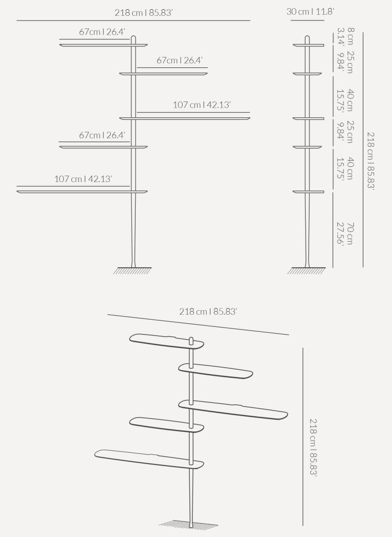 Thanks to its flexible design, the shelf can be tailored to individual needs and the character of the interior. It is an elegant shelf that highlights the architecture of the space while maximizing wall usage, all while maintaining a sense of visual lightness.