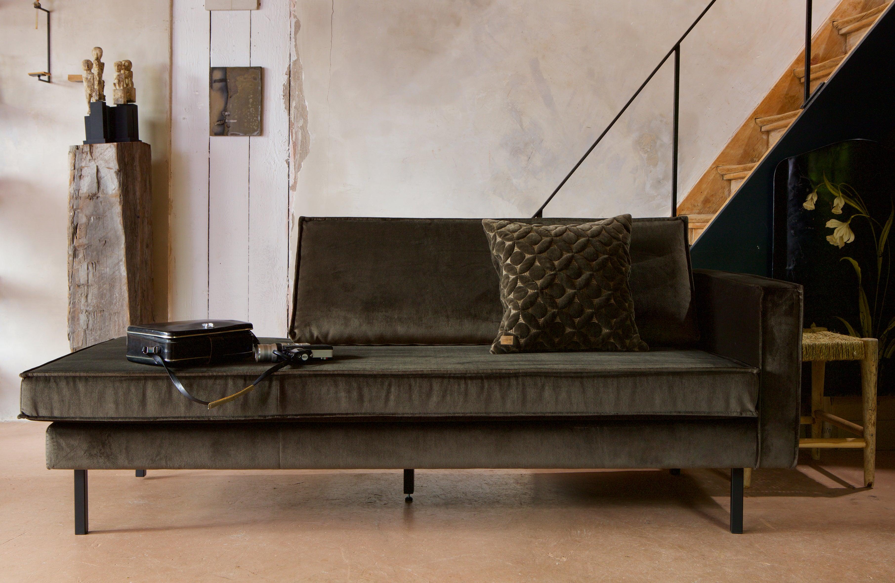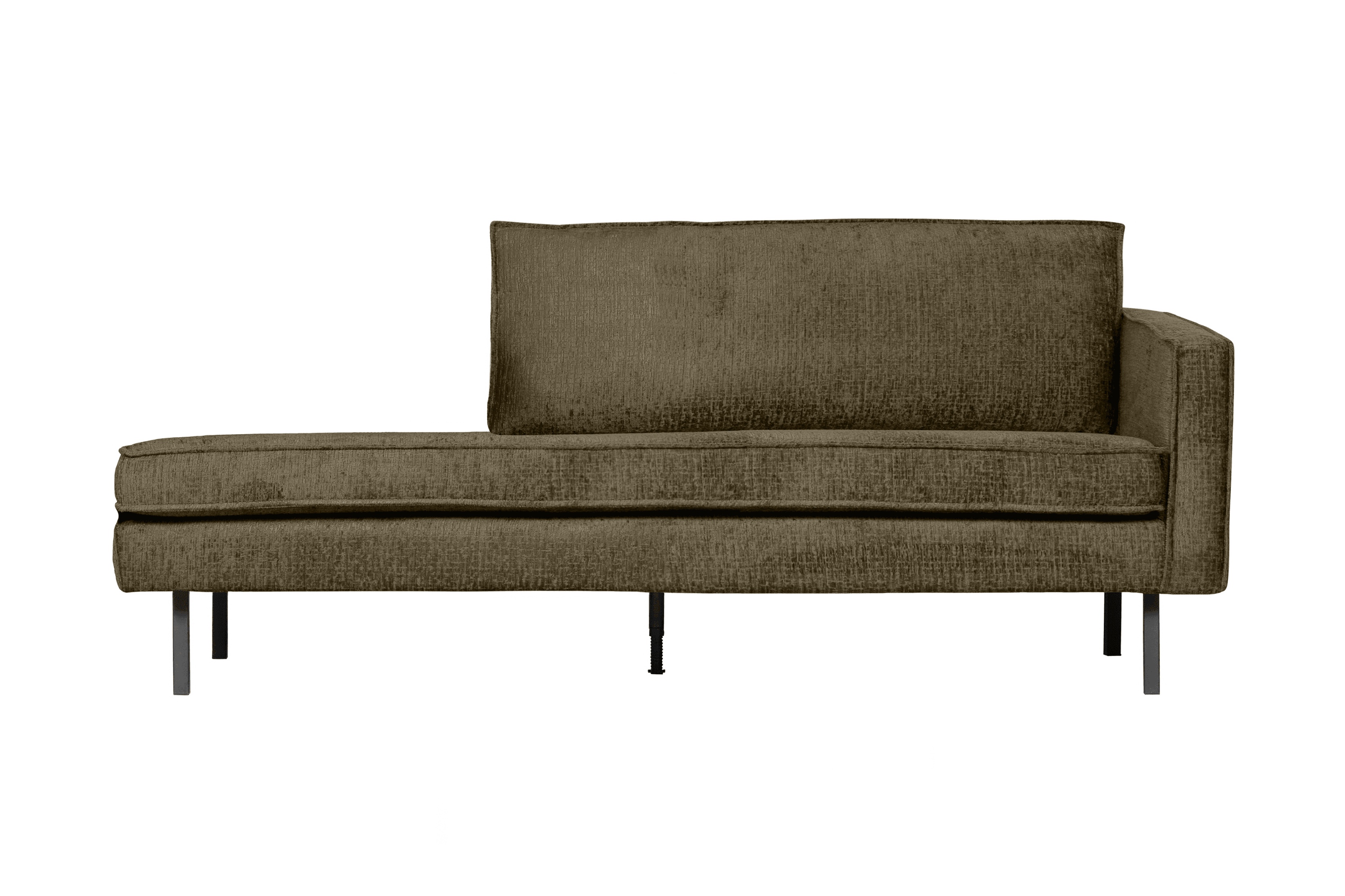 The sleek frame of the right-sided daybed Rodeo in dark green, as if floating in the air, presents itself subtly on the screen, like a character created by a master of cinematography. Its black metal legs look like perfectly trained muscles, ready to explode with energy. It's like holding a metal tonfa in your hands, poised to perform in a spectacular show. It's strength, coordination, and harmony in one.