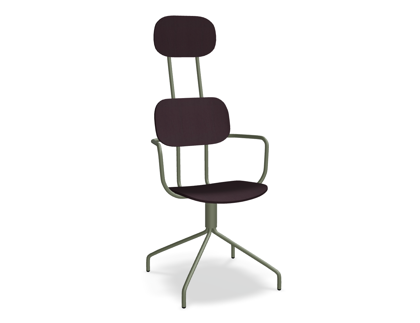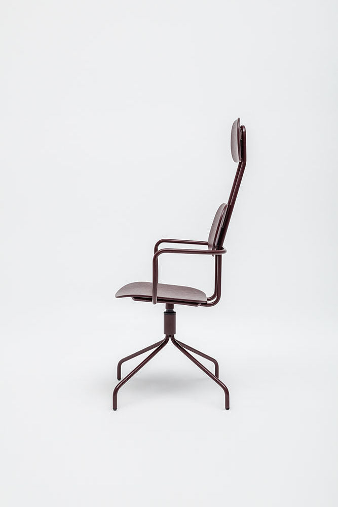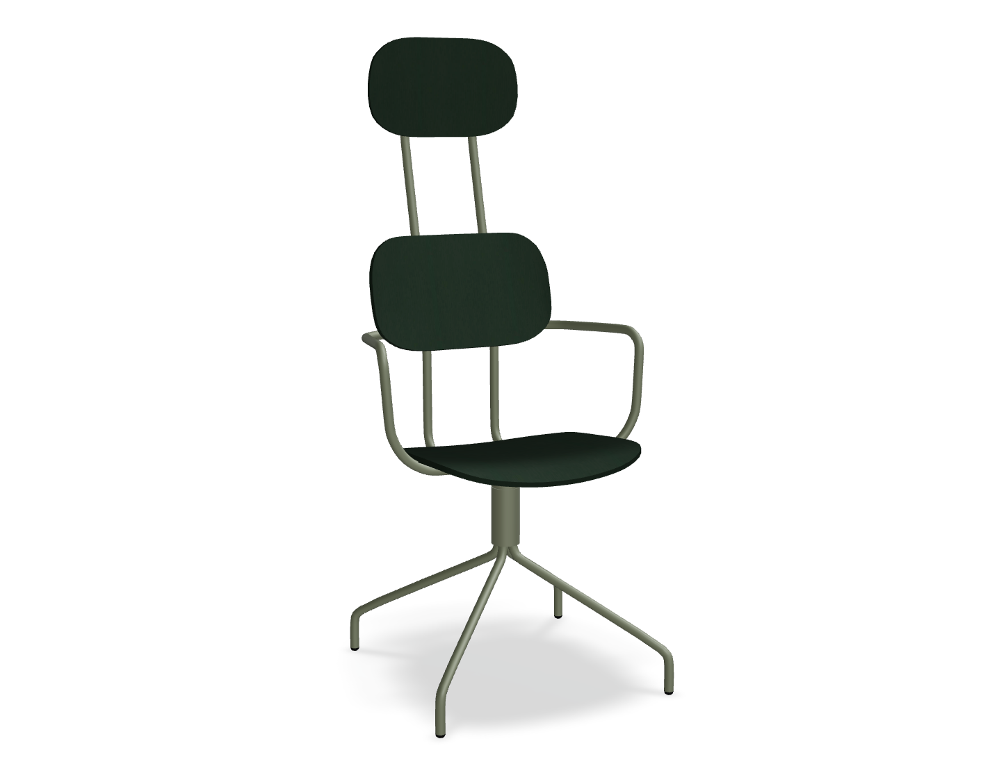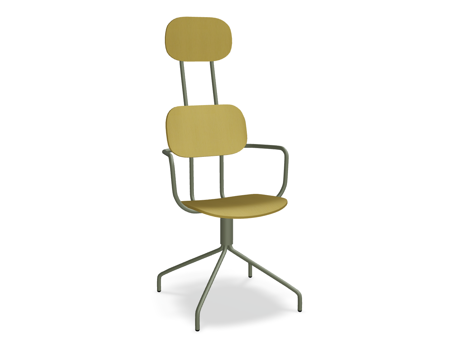 Swivel chair The new school with a headrest, designed by Studio Form US with Love, attracts attention with a modern form with double support. This backrest not only emphasizes modern design, but also provides excellent support for the whole back. The rotating base guarantees freedom of movement, and optional armrests further increase the comfort of use. The plywood version is distinguished by durability and ease of care, which makes it an ideal choice to the space used by many people.