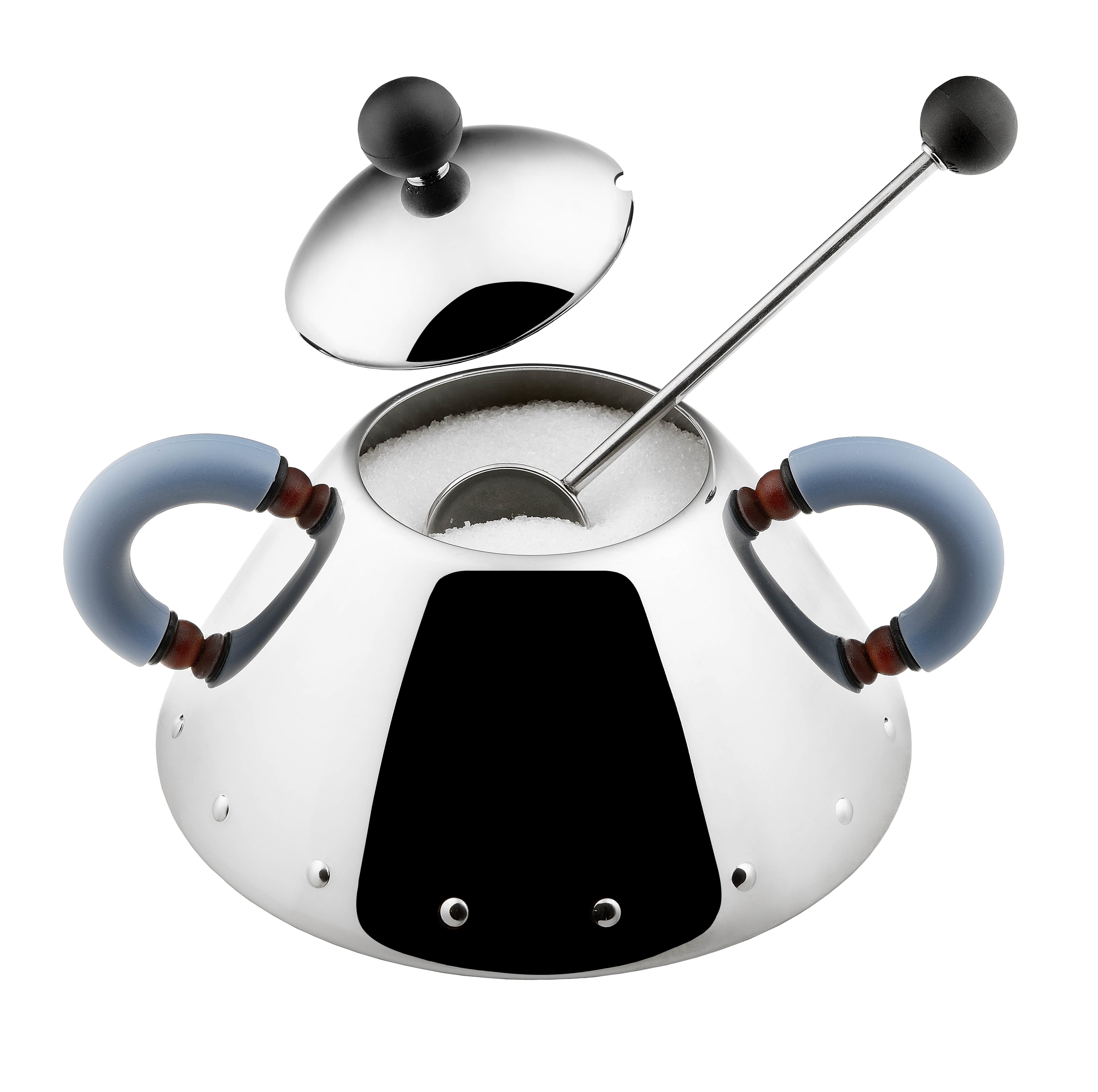 Sugar bowl 9097 is a style icon designed by Michael Graves. Made of polished stainless steel, it impresses with conical shape and black handles that add elegance and convenience of use.