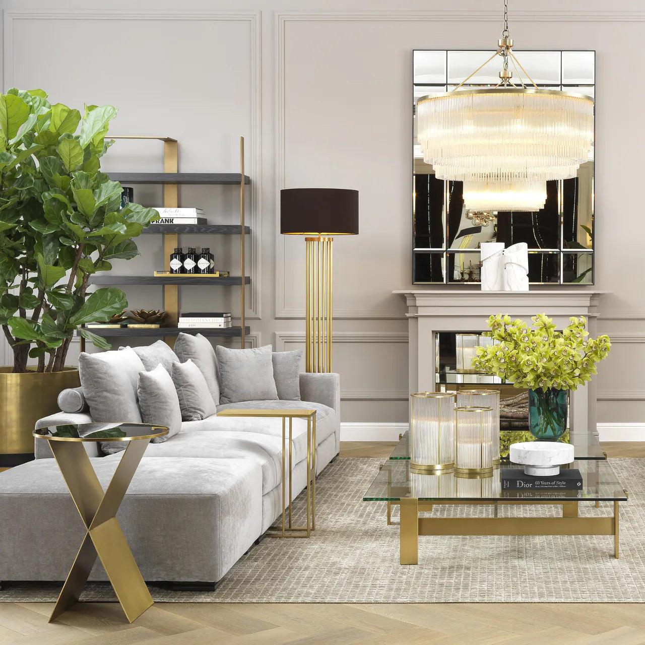 The tabletop, crafted from antique mirrored glass, is another masterful touch. It reflects light and adds depth to any area, while the elegantly adorned edge in antique gold highlights the luxurious character of this piece.