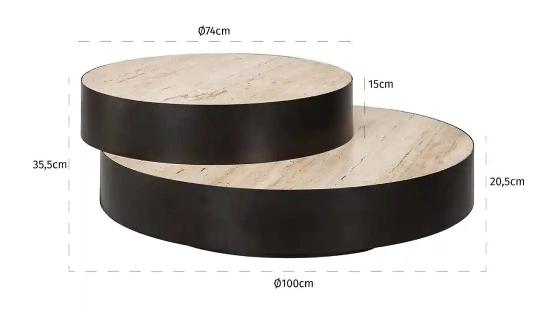 The elegant coffee table Avalon in a modern form is a proposal that will add a unique character to your interior. The round top made of travertine combined with a dark, sturdy base of plywood and iron creates a harmonious blend of natural beauty and industrial strength. Its geometric shape makes it a focal point of the arrangement, ideal for both minimalist and more expressive spaces.