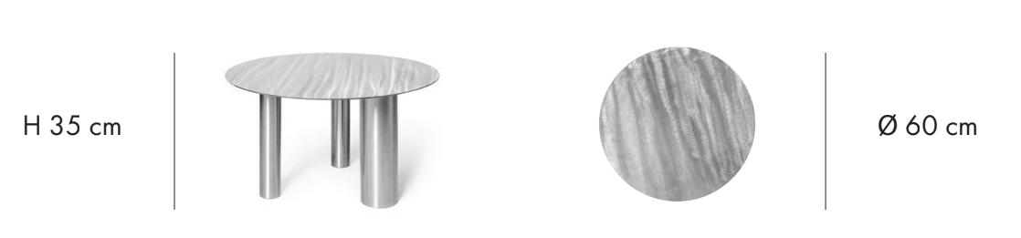 Coffee table Brandt CS1 is an elegant piece inspired by the Bauhaus movement, combining modern elegance with functionality. The table Brandt CS1 is made entirely of stainless steel, featuring a smooth top and three cylindrical legs of varying diameters that create a balanced asymmetry. The hand-brushed surface of the top resembles waves on water, making each piece a unique work of functional art.