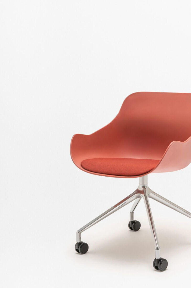 Swivel chair Baltic Remix, designed by Krystian Kowalski, is a modern piece of furniture ideal for offices, conference rooms and educational spaces. The polished aluminum base and a colorful seat bring positive energy into the interior. The bucket seat with a soft upholstered pillow and integrated armrests ensures comfort, and the rotating base on optional wheels increases mobility and productivity.