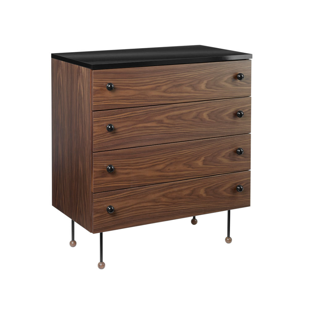 Cabinet 62 is a timeless design by Greta M. Grossman from 1952, which, despite its age, still captivates with its modern form. Its name refers to the moment it was recognized as a decade ahead of its time. The unique combination of an elegant body made of American walnut and a delicate base on slender steel legs ending in balls gives the furniture a lightness and subtle form. The black, glossy finish of the top contrasts with the natural wood, introducing an element of luxury and sophistication.