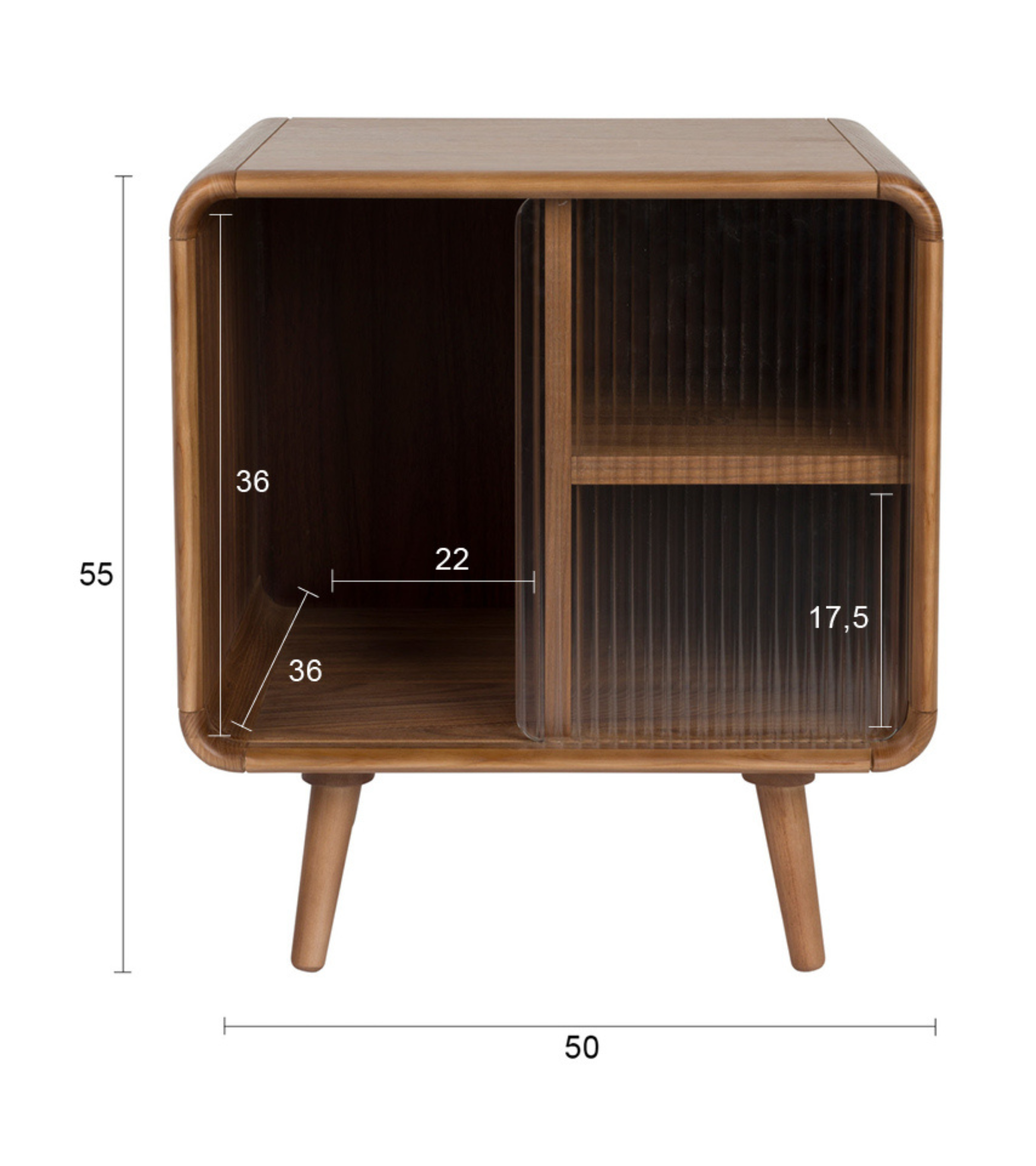 Cabinet Rise is a stylish combination of functionality and refined design. The rounded lines and distinctive doors made of ribbed glass give it a unique charm. The warm walnut finish highlights the natural beauty of the wood and introduces a cozy atmosphere inspired by 70s aesthetics. It's a compact yet striking piece of furniture that will look great next to your bed or as a small side cabinet by your armchair.