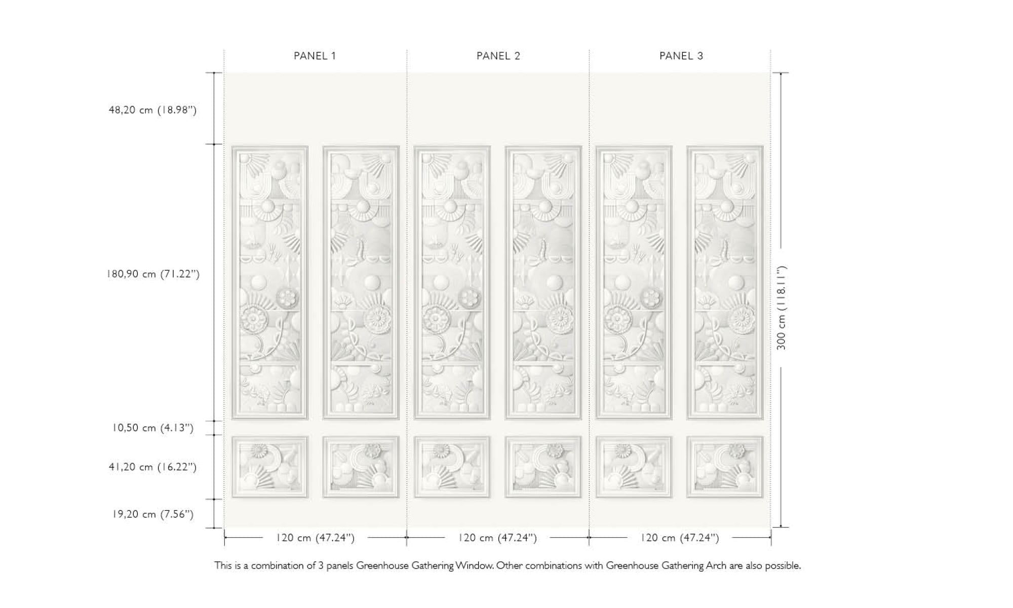 Mural Greenhouse Gathering Arch is a unique wall decoration inspired by decorative plasterwork and the aesthetics of art deco. The monochromatic composition evokes classic plaster forms and architectural details, creating an effect of subtle elegance. The motif references the view through glass panels of a greenhouse, revealing the richness of lush flowers and decorative structures, making the mural a perfect fit for luxurious and timeless interior designs.