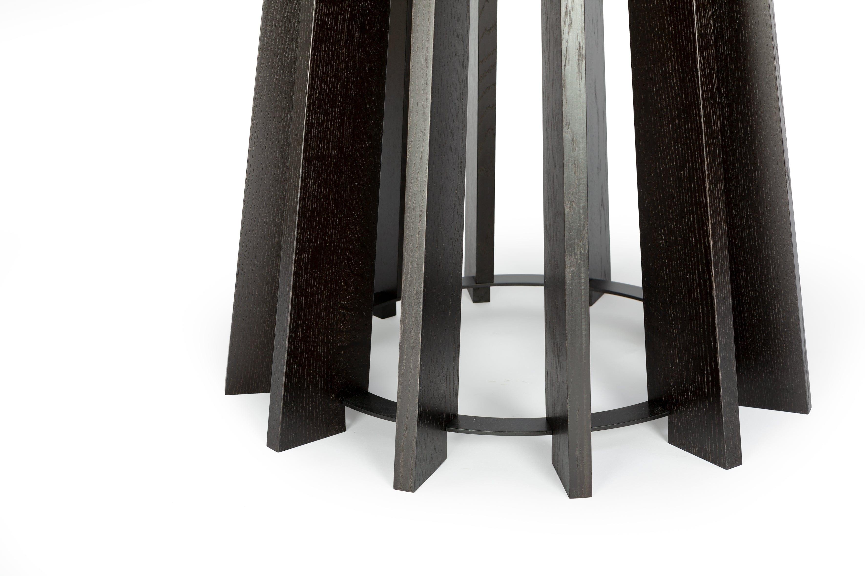 Designer table Molde is the essence of elegance and modernity. It is made of solid oak, and the round top, with a distinct wood grain, is supported by an original base with a geometric shape. The whole piece will catch the eye of every guest and add a refined character to the interior.
