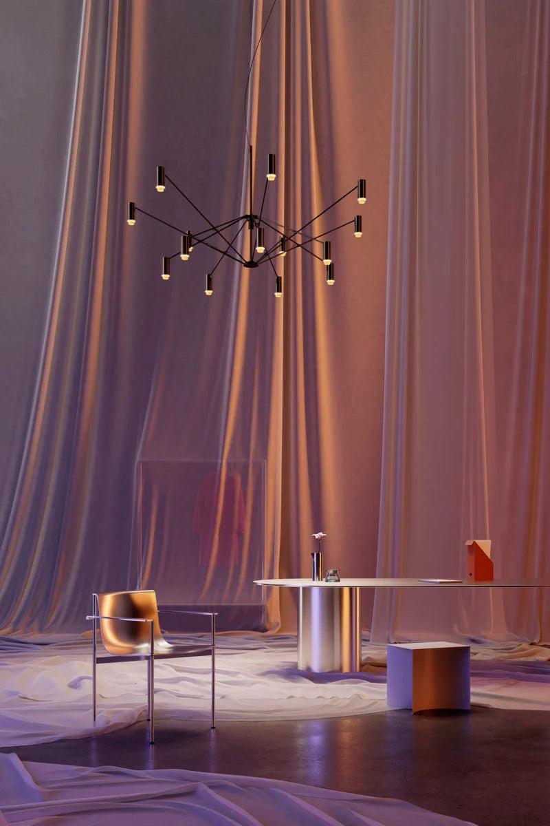 A light, subdued and functional design with a large presence, which can change shape, opening to expand the light to a diameter of 2 meters in the case of large spaces, or folding to a diameter of 1.2 meters to focus on a smaller area. Designers say that standing under an open lamp you can feel like under the dome of light. The key feature is that regardless of the size, it always provides unique lighting of the environment.