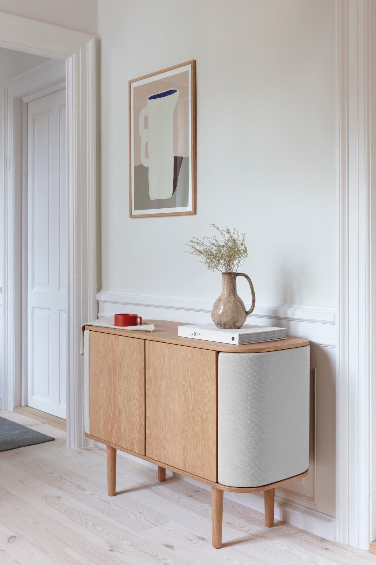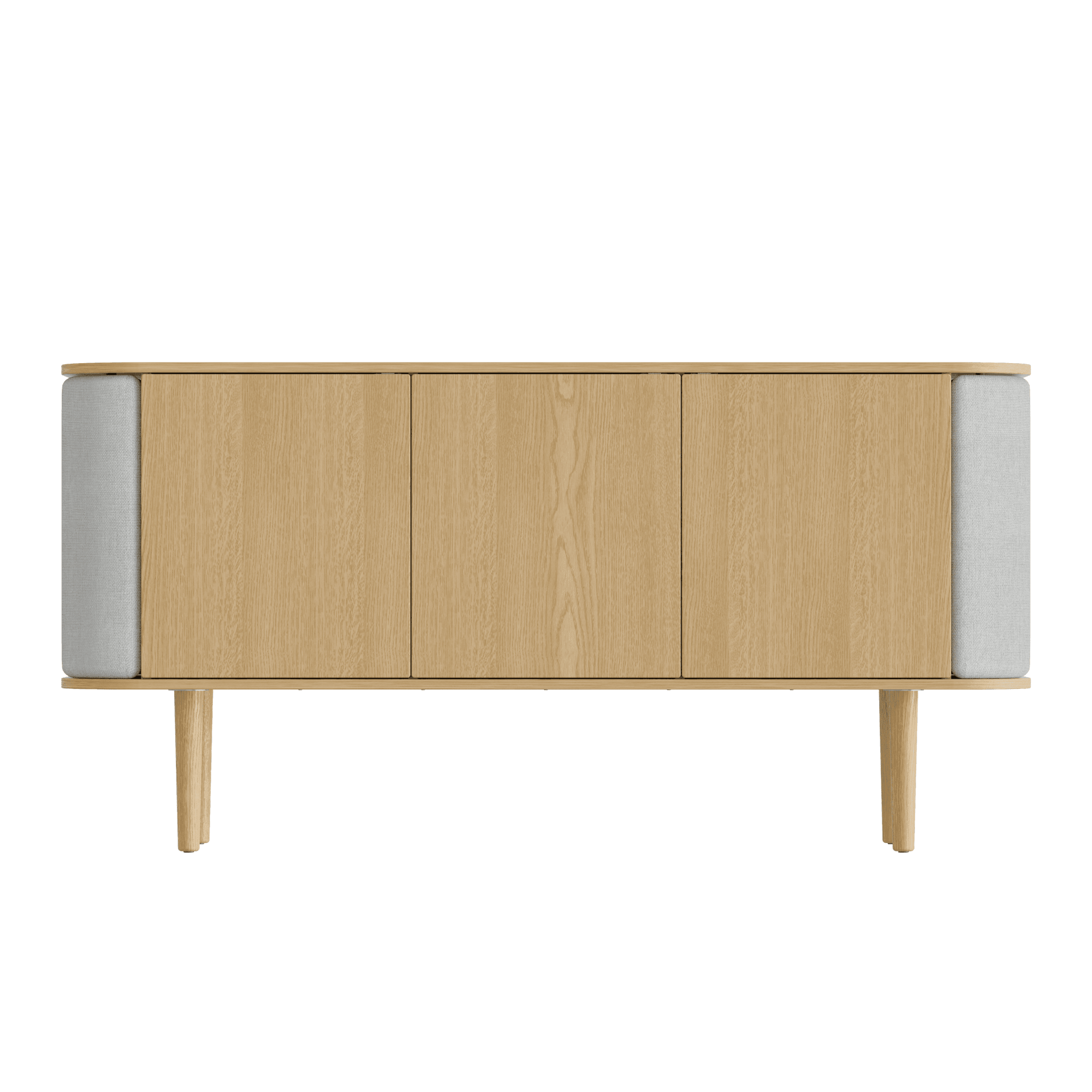 Dresser Treasures emanates a Nordic style. Its housing is made of veneered oak wood, and the curved sides of the cabinet have an adjustable cover, giving treasures a pleasant, soft touch.