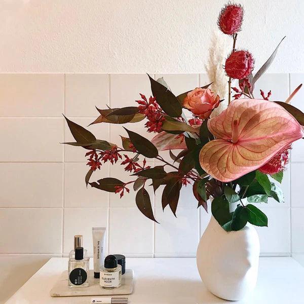 Vase Upside-Down in white is a design created by Koens & Middelkoop. This model is fully porcelain, with a matte surface that adds a touch of cool, yet extraordinary character. This custom vase will be a wonderful decorative accent, as well as an unconventional element that will further highlight the beauty of a bouquet of flowers.