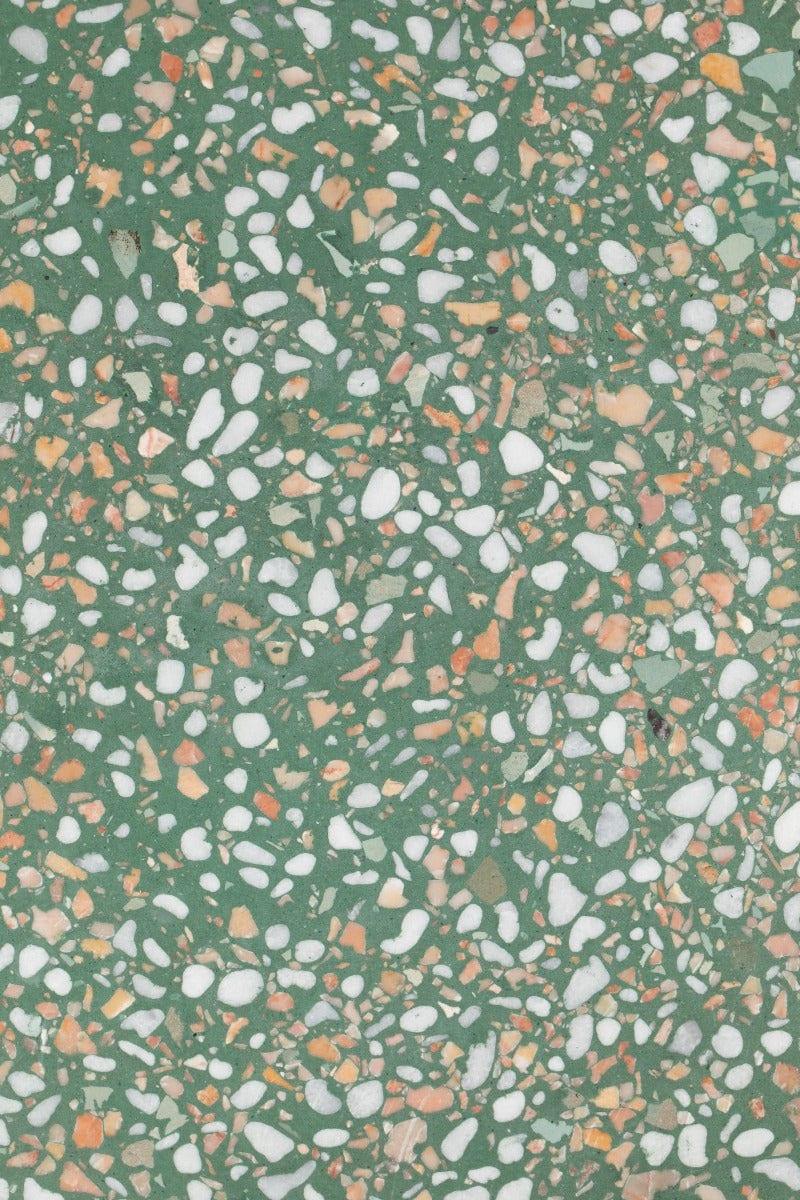 Table Victoria is made from an Italian invention of the 15th century - terrazzo, in a green color, which is a concrete mass containing stone aggregate. Just look at those delicate colorful specks; don't they add elegance?