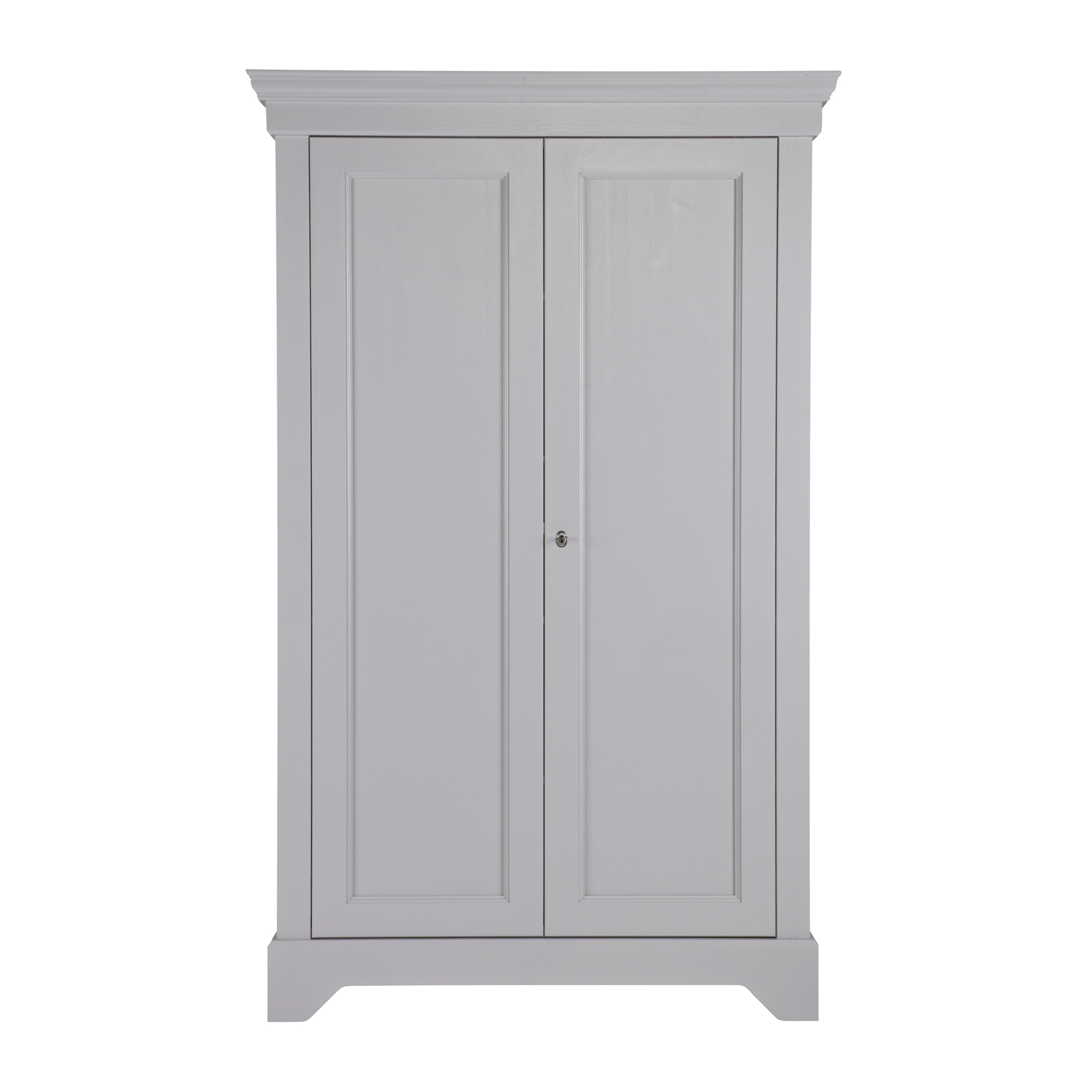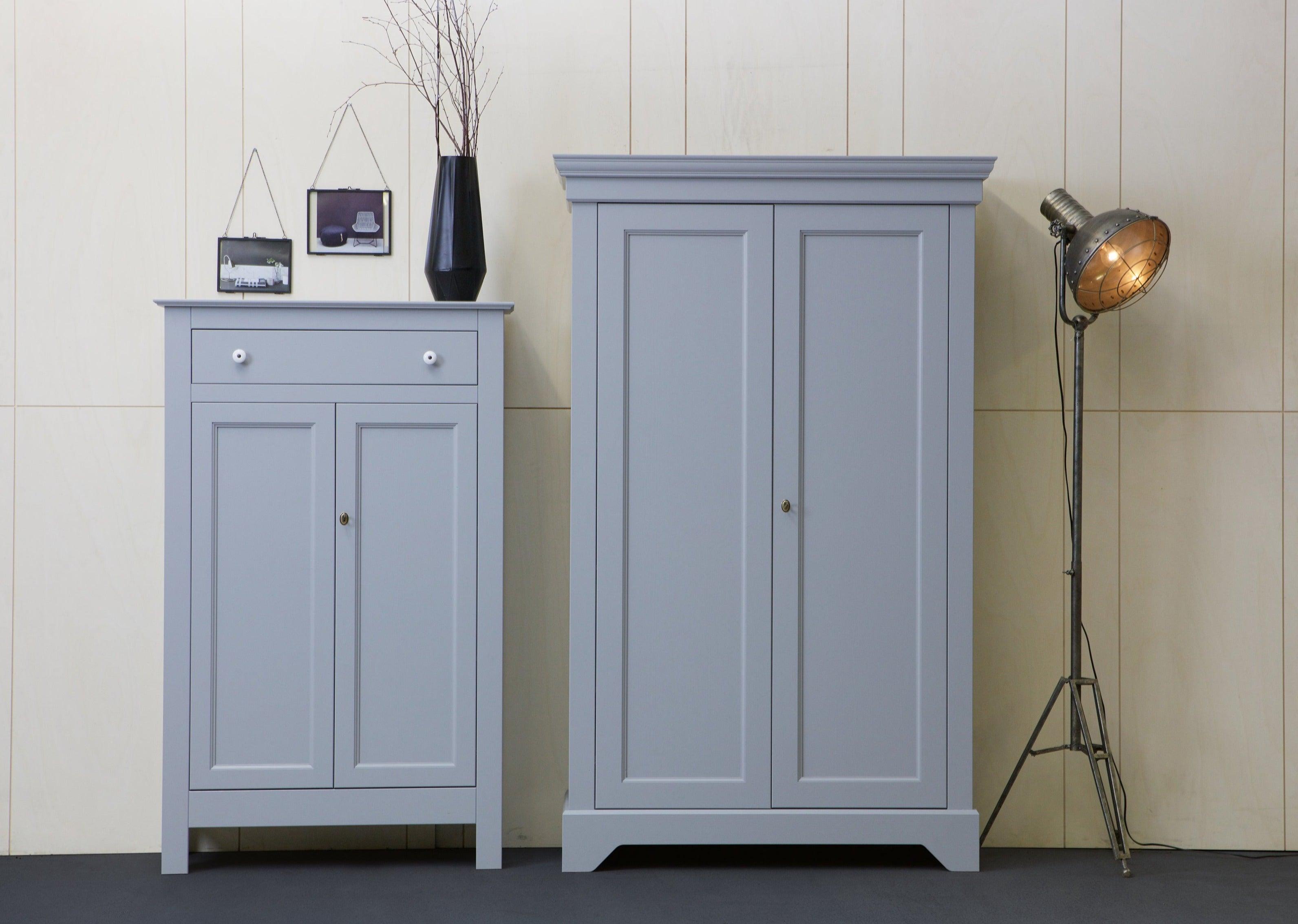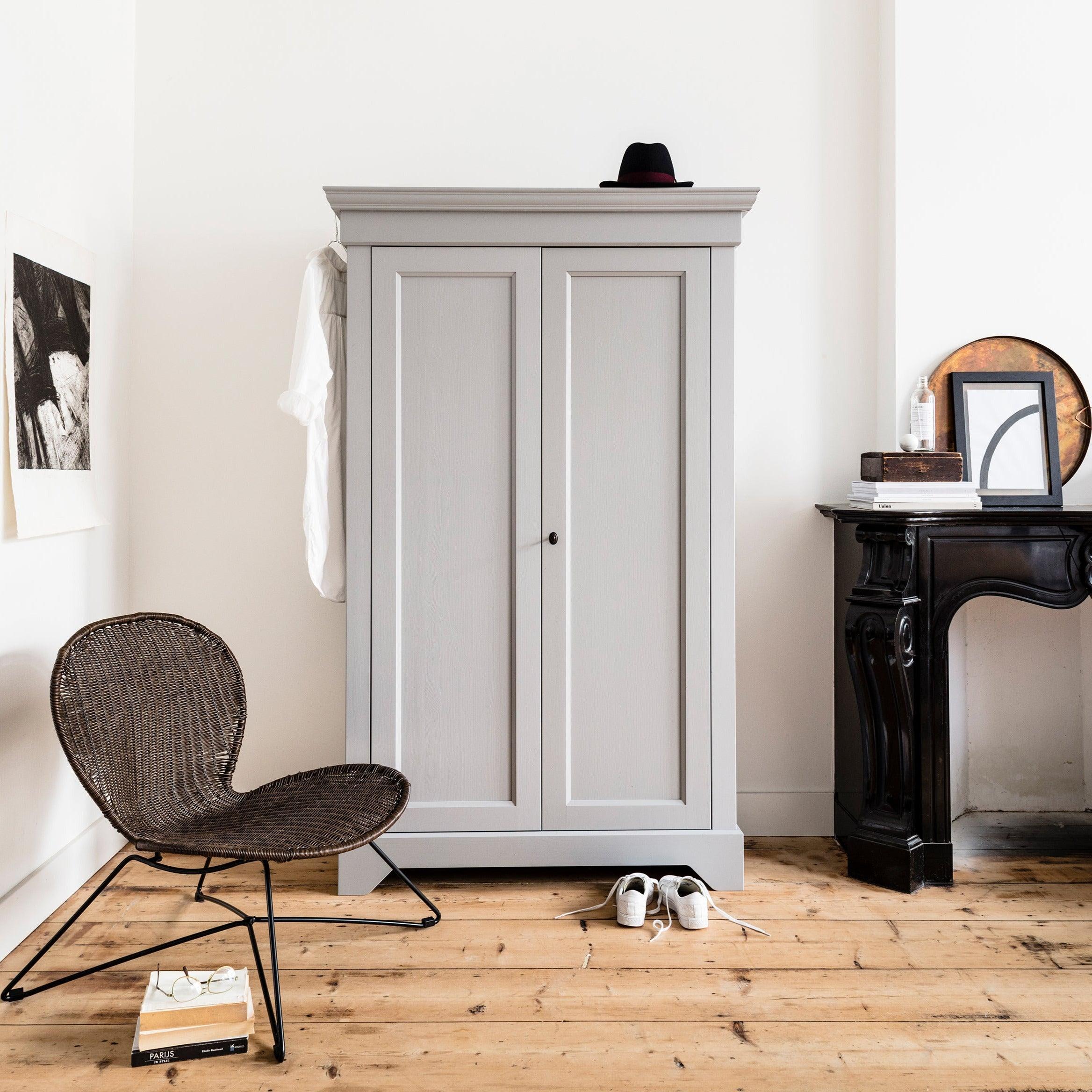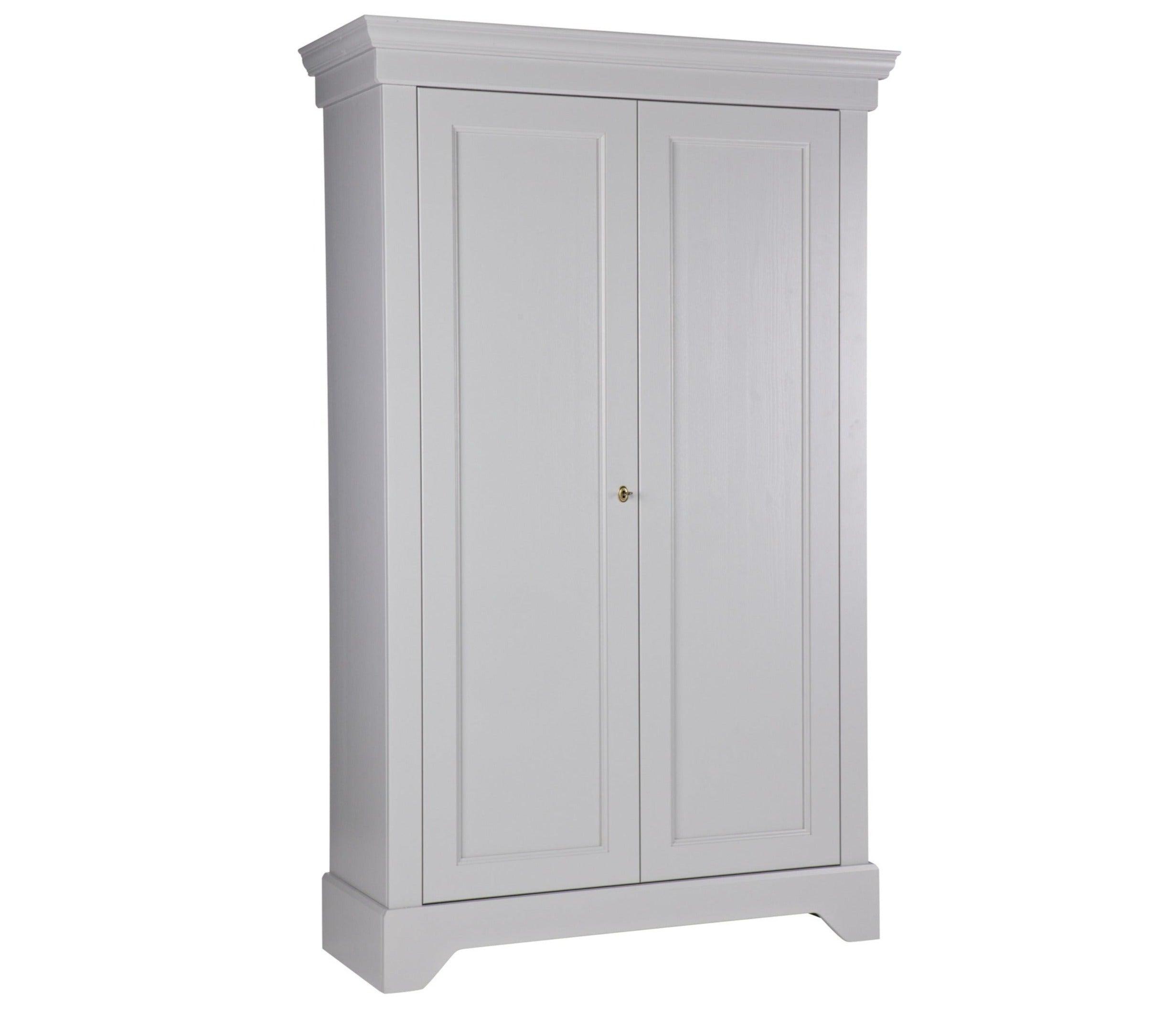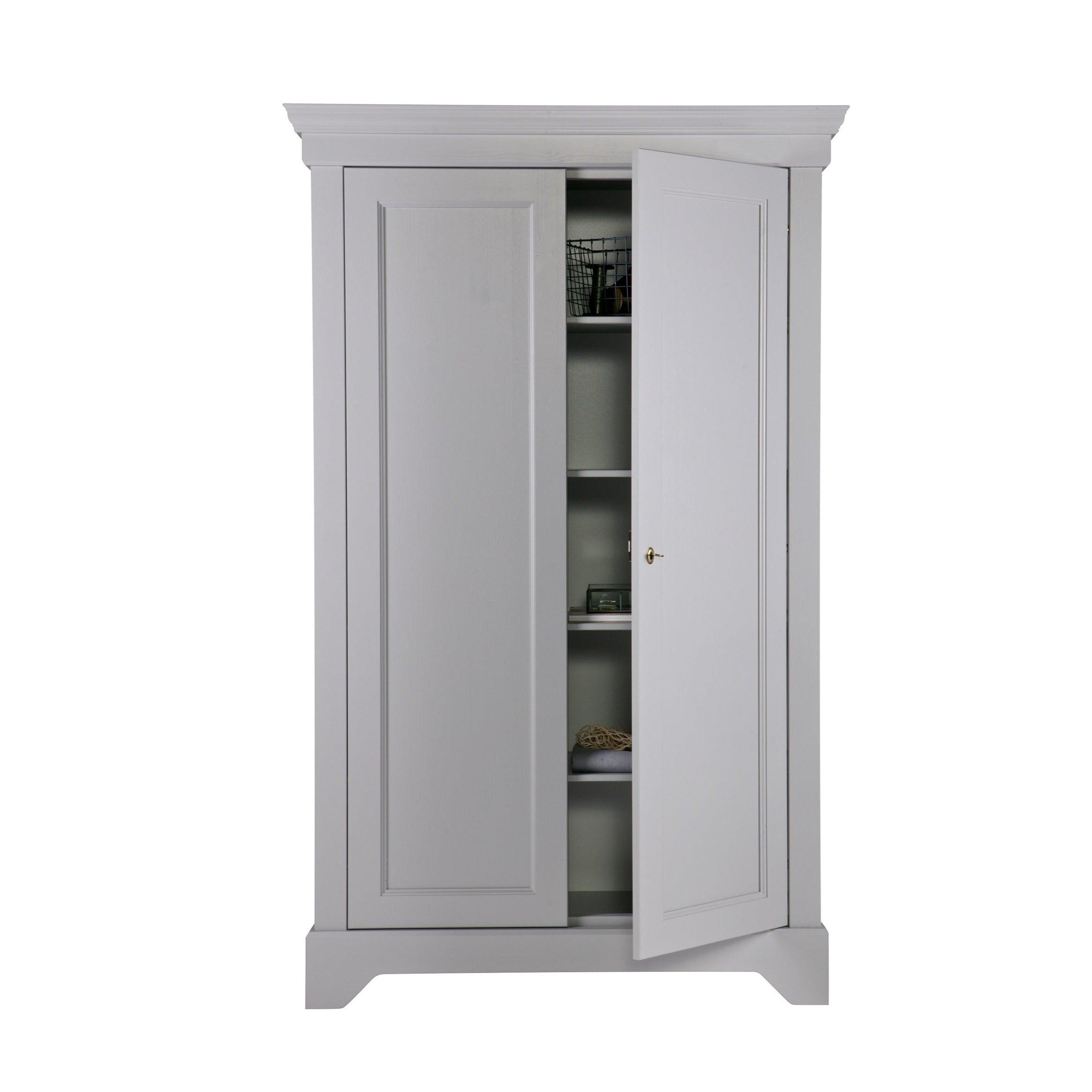 The gray Isabel wardrobe is made from durable materials that ensure its longevity and durability. The two doors open easily, revealing a storage space that is spacious enough to hold everything you need - from clothes to bedding or towels.