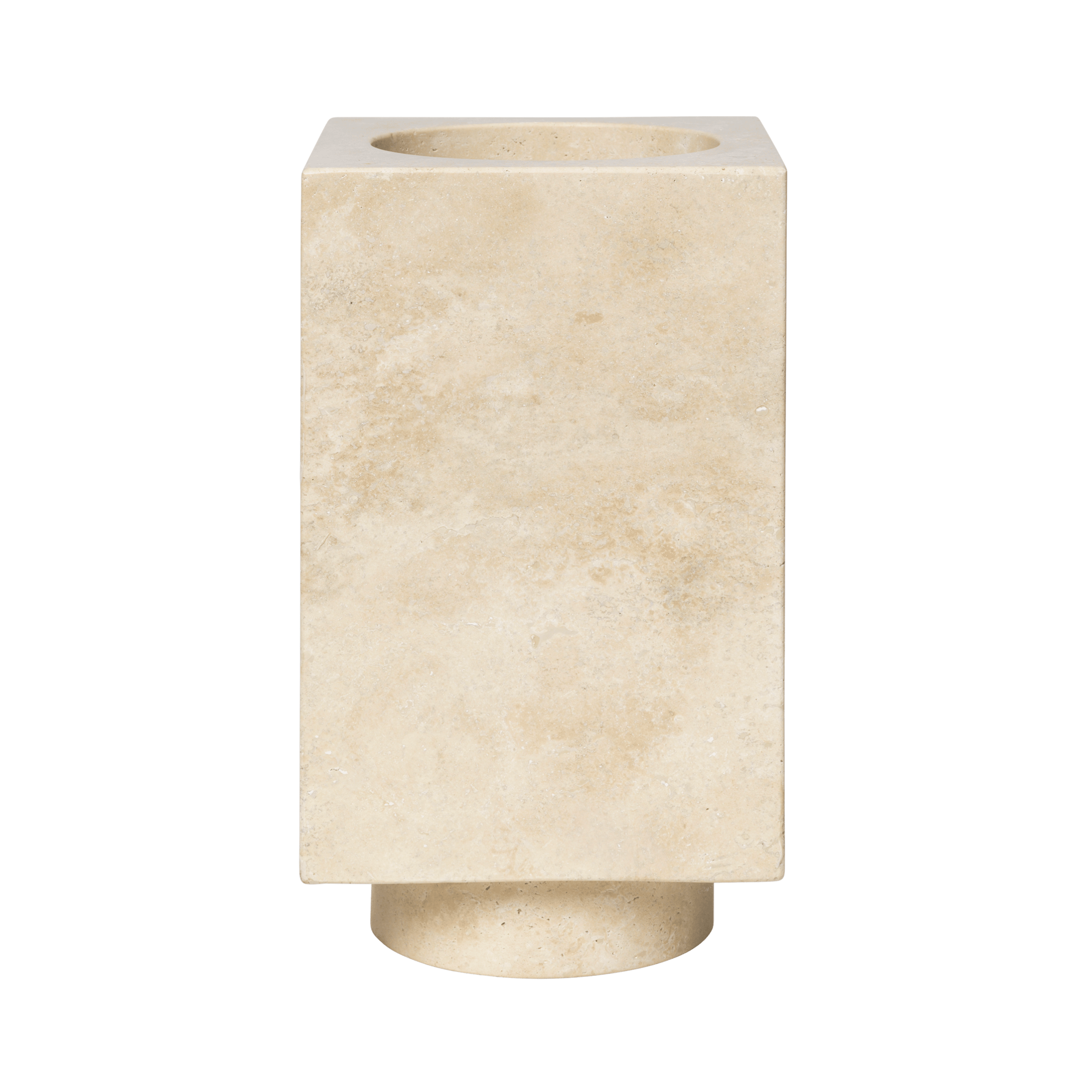 Thanks to its monolithic form and natural finish, the Hew vase works wonderfully as both a standalone decorative accent and an elegant setting for single flowers. Each piece is unique due to the natural variations in the structure of the travertine.