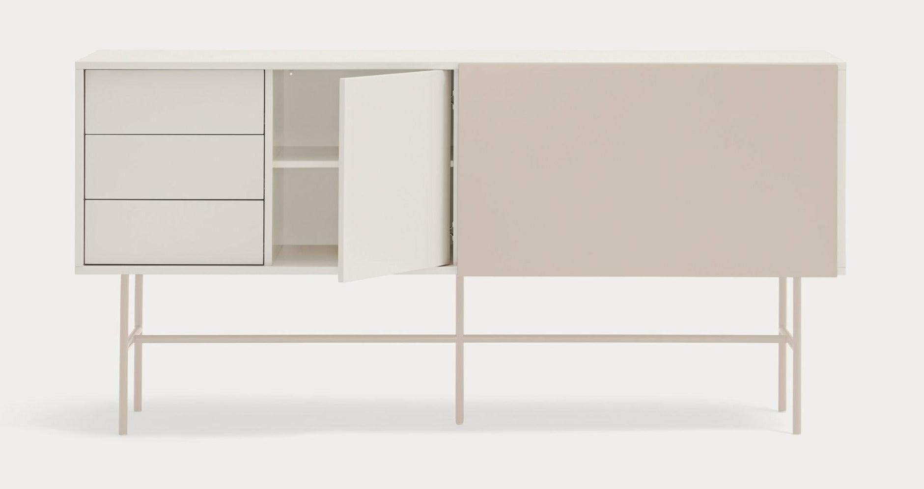 Wide cabinet with a unique beige white color. The Nube collection is distinguished by an unusual and expressive configuration thanks to the sliding door, which can be freely set up, adapting to individual preferences. The way this door moves on the wide nube cabinet, revealing and hiding various parts of its interior, derives inspiration from the way the clouds move in the sky.