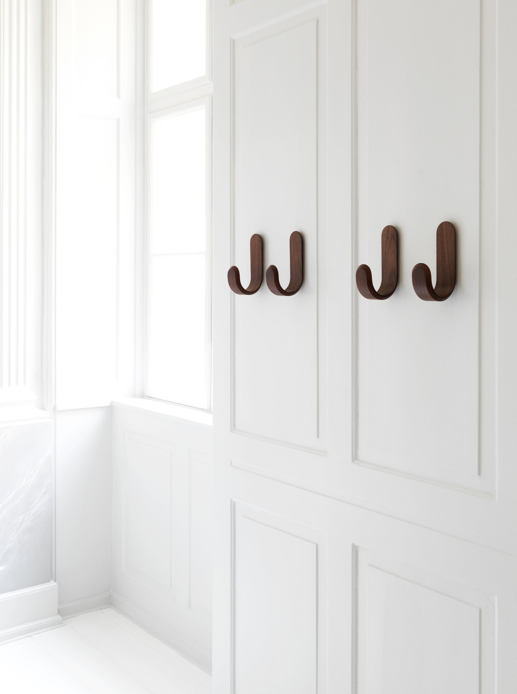 Curve is a wall hanger in a classic J shape that combines simplicity with the natural charm of wood. Made from walnut, it features a warm color palette and distinct grain, adding elegance and coziness to the interior. Its intuitive form makes it perfect for stylishly hanging clothes, towels, or bags.