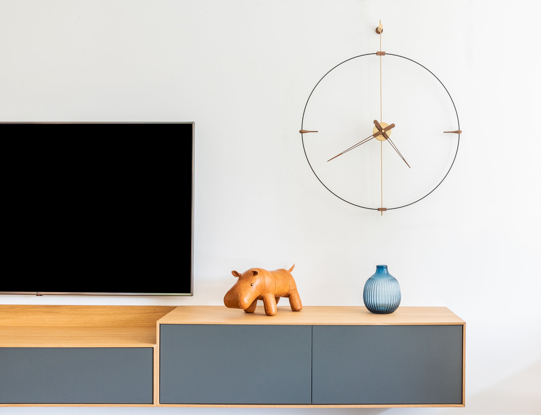 The clock Mini Bilbao stands out with its elegant finish in polished brass, which gives it a more luxurious and striking character. The combination of brass, walnut, and black fiberglass creates a harmonious composition, perfect for modern and exclusive spaces. The precise German UTS mechanism ensures reliable and silent operation, making this modern wall clock ideal for a living room, office, or elegant study.